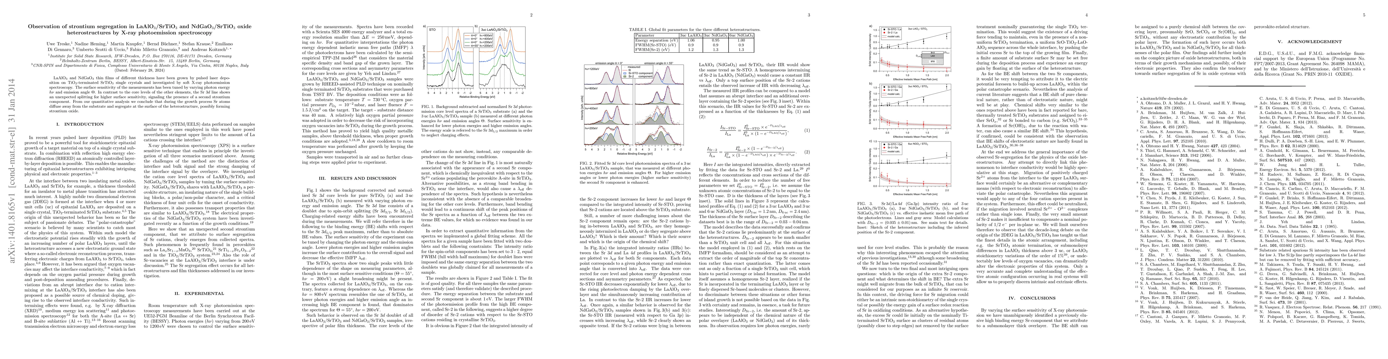 Researchers used X-ray photoemission spectroscopy to study the surface segregation of strontium in LaAlO3/SrTiO3 and NdGaO3/SrTiO3 oxide heterostructures, finding evidence of a second strontium component at the surface.