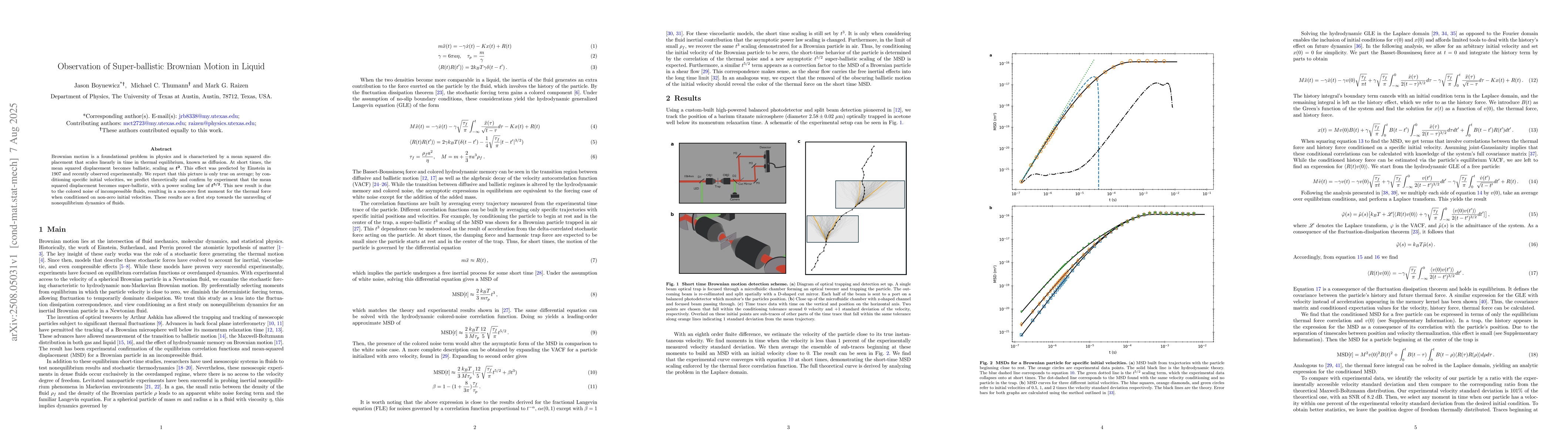 Brownian motion is a foundational problem in physics and is characterized by a mean squared displacement that scales linearly in time in thermal equilibrium, known as diffusion. At short times, the mean squared displacement becomes ballistic, scaling as t^2. This effect was predicted by Einstein in 1907 and recently observed experimentally. We report that this picture is only true on average; by conditioning specific initial velocities, we predict theoretically and confirm by experiment that the mean squared displacement becomes super-ballistic, with a power scaling law of t^(5/2). This new result is due to the colored noise of incompressible fluids, resulting in a non-zero first moment for the thermal force when conditioned on non-zero initial velocities. These results are a first step towards the unraveling of nonequilibrium dynamics of fluids.
