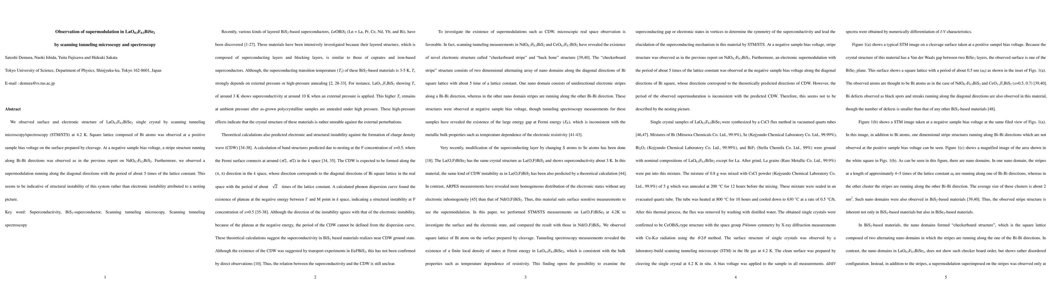 This study utilized scanning tunneling microscopy/spectroscopy (STM/STS) to observe the surface and electronic structure of LaO0.5F0.5BiSe2 at 4.2 K, revealing a square lattice of Bi atoms and a stripe structure at different bias voltages. Notably, a supermodulation with a period five times the lattice constant was detected, suggesting structural instability rather than electronic instability.