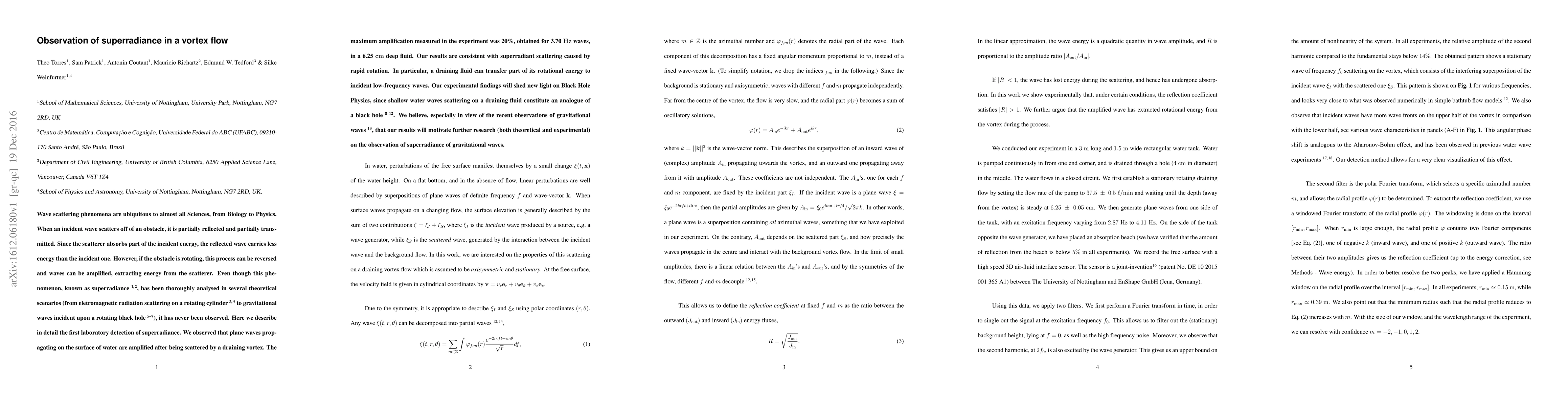 Wave scattering phenomena are ubiquitous to almost all Sciences, from Biology to Physics. When an incident wave scatters off of an obstacle, it is partially reflected and partially transmitted. Since the scatterer absorbs part of the incident energy, the reflected wave carries less energy than the incident one. However, if the obstacle is rotating, this process can be reversed and waves can be amplified, extracting energy from the scatterer. Even though this phenomenon, known as superradiance, has been thoroughly analysed in several theoretical scenarios (from eletromagnetic radiation scattering on a rotating cylinder to gravitational waves incident upon a rotating black hole), it has never been observed. Here we describe in detail the first laboratory detection of superradiance. We observed that plane waves propagating on the surface of water are amplified after being scattered by a draining vortex. The maximum amplification measured in the experiment was 20%, obtained for 3.70 Hz waves, in a 6.25 cm deep fluid. Our results are consistent with superradiant scattering caused by rapid rotation. In particular, a draining fluid can transfer part of its rotational energy to incident low-frequency waves. Our experimental findings will shed new light on Black Hole Physics, since shallow water waves scattering on a draining fluid constitute an analogue of a black hole. We believe, especially in view of the recent observations of gravitational waves, that our results will motivate further research (both theoretical and experimental) on the observation of superradiance of gravitational waves.