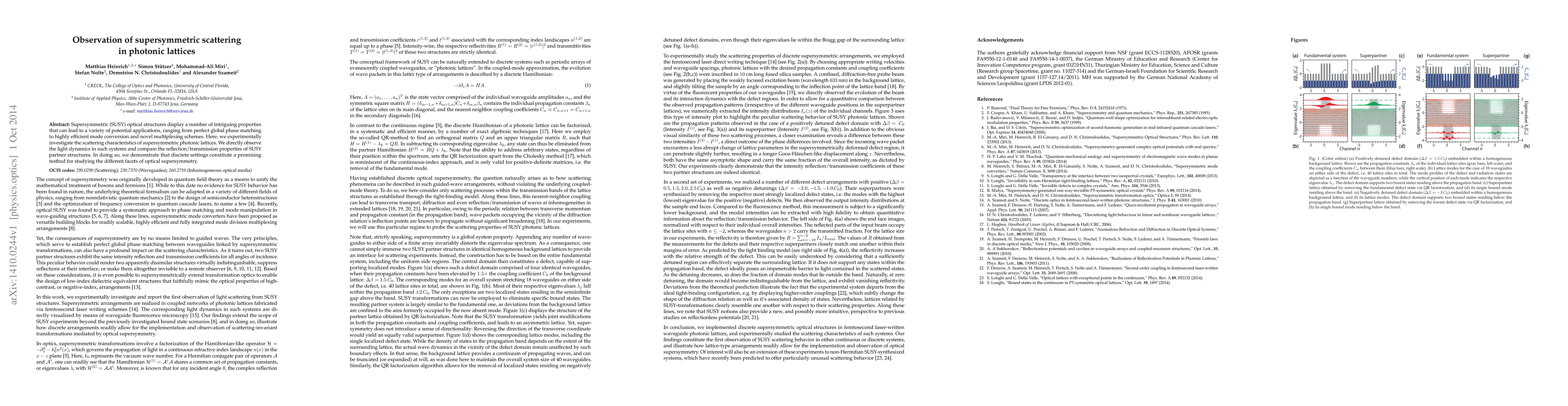 Supersymmetric (SUSY) optical structures display a number of intriguing properties that can lead to a variety of potential applications, ranging from perfect global phase matching to highly efficient mode conversion and novel multiplexing schemes. Here, we experimentally investigate the scattering characteristics of supersymmetric photonic lattices. We directly observe the light dynamics in such systems and compare the reflection/transmission properties of SUSY partner structures. In doing so, we demonstrate that discrete settings constitute a promising testbed for studying the different facets of optical supersymmetry.