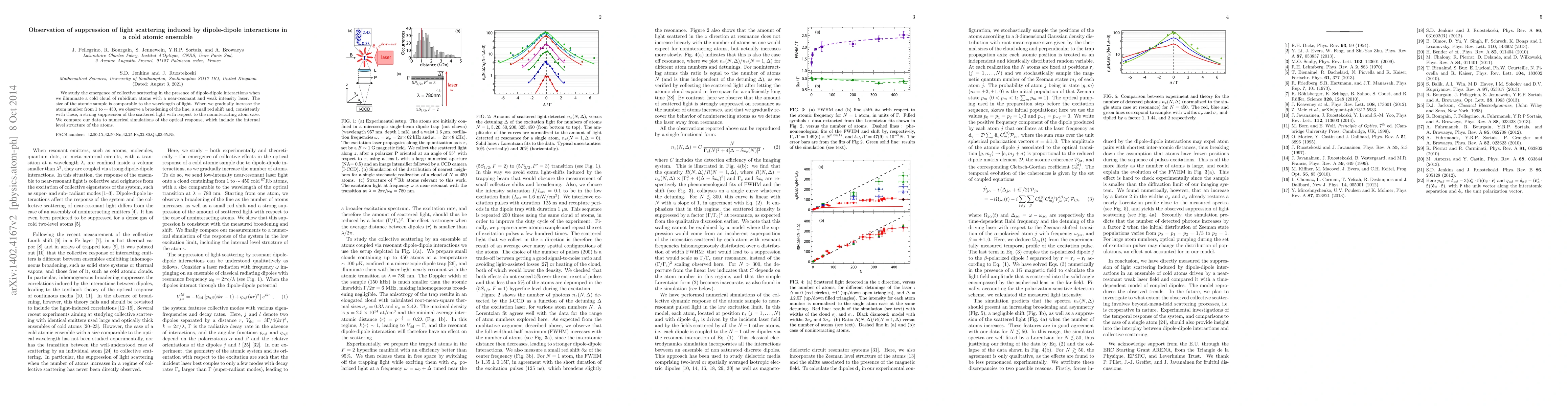 We study the emergence of collective scattering in the presence of dipole-dipole interactions when we illuminate a cold cloud of rubidium atoms with a near-resonant and weak intensity laser. The size of the atomic sample is comparable to the wavelength of light. When we gradually increase the atom number from 1 to 450, we observe a broadening of the line, a small red shift and, consistently with these, a strong suppression of the scattered light with respect to the noninteracting atom case. Numerical simulations, which include the internal atomic level structure, agree with the data.