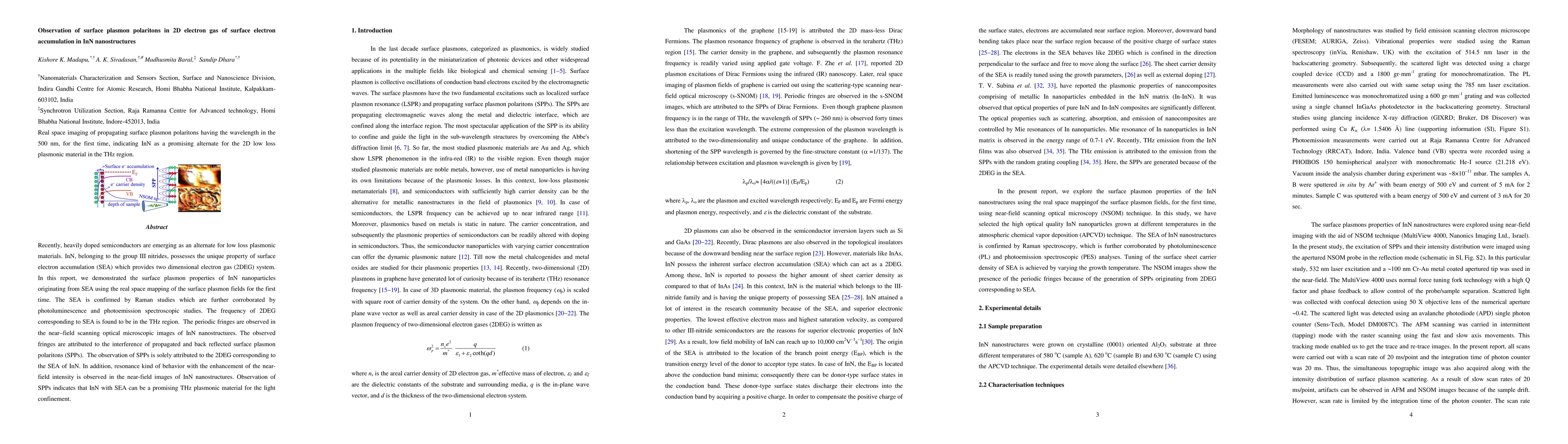 This paper demonstrates the observation of surface plasmon polaritons (SPPs) in InN nanostructures due to surface electron accumulation (SEA) forming a 2D electron gas (2DEG). The study confirms SEA via Raman, photoluminescence, and photoemission spectroscopy, and observes periodic fringes in near-field scanning optical microscopy, indicating the potential of InN as a THz plasmonic material.
