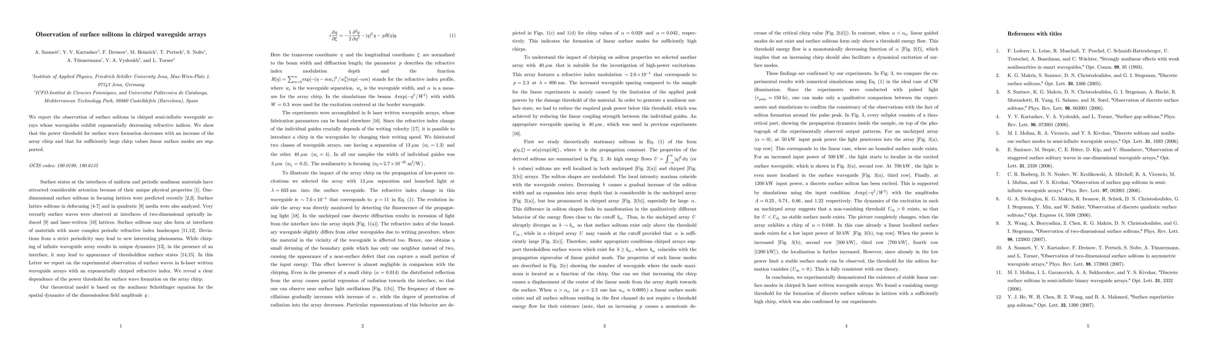 Summary: Researchers observed surface solitons in chirped waveguide arrays with exponentially decreasing refractive indices, finding that the power threshold for surface wave formation decreases with increased chirp, enabling linear surface modes for large chirp values.