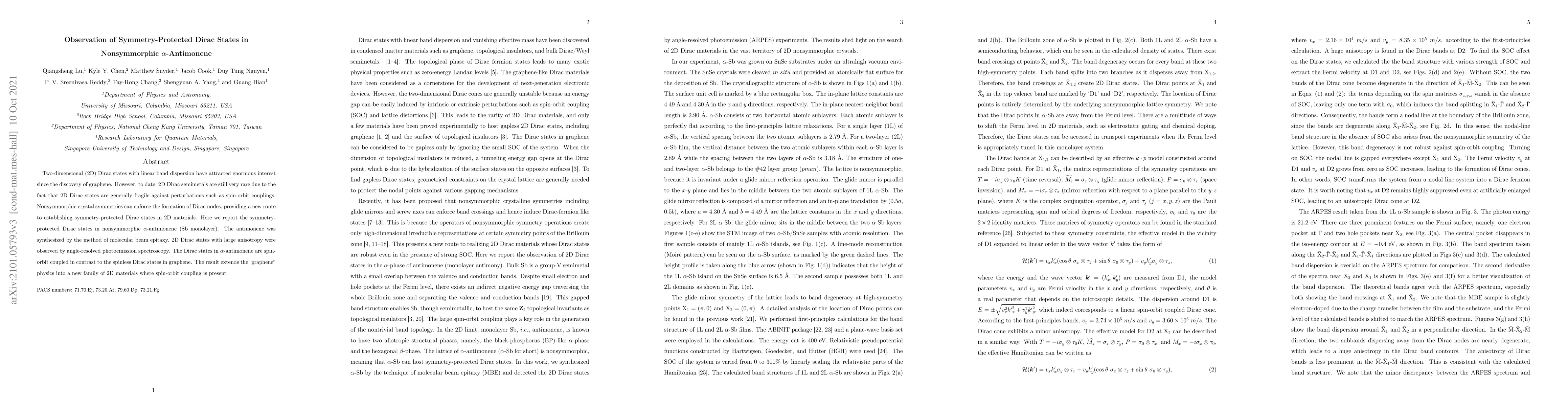 This paper reports the observation of symmetry-protected Dirac states in nonsymmorphic α-antimonene using molecular beam epitaxy and angle-resolved photoemission spectroscopy. The study highlights the presence of spin-orbit coupling in these states, contrasting with the spinless Dirac states in graphene.