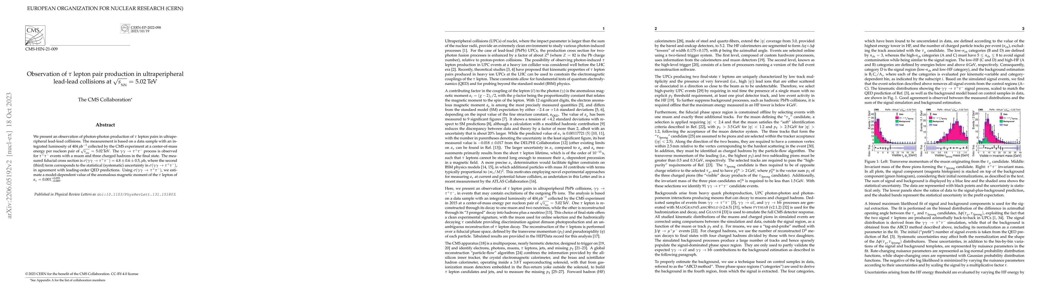 We present an observation of photon-photon production of $\tau$ lepton pairs in ultraperipheral lead-lead collisions. The measurement is based on a data sample with an integrated luminosity of 404 $\mu$b$^{-1}$ collected by the CMS experiment at a nucleon-nucleon center-of-mass energy of 5.02 TeV. The $\gamma\gamma$ $\to$ $\tau^+\tau^-$ process is observed for $\tau\tau$ events with a muon and three charged hadrons in the final state. The measured fiducial cross section is $\sigma(\gamma\gamma$ $\to$ $\tau^+\tau^-)$ = 4.8 $\pm$ 0.6 (stat) $\pm$ 0.5 (syst) $\mu$b, in agreement with leading-order QED predictions. Using $\sigma(\gamma\gamma$ $\to$ $\tau^+\tau^-)$, we estimate a model-dependent value of the anomalous magnetic moment of the $\tau$ lepton of $a_\tau$ = 0.001 $^{+0.055}_{-0.089}$.