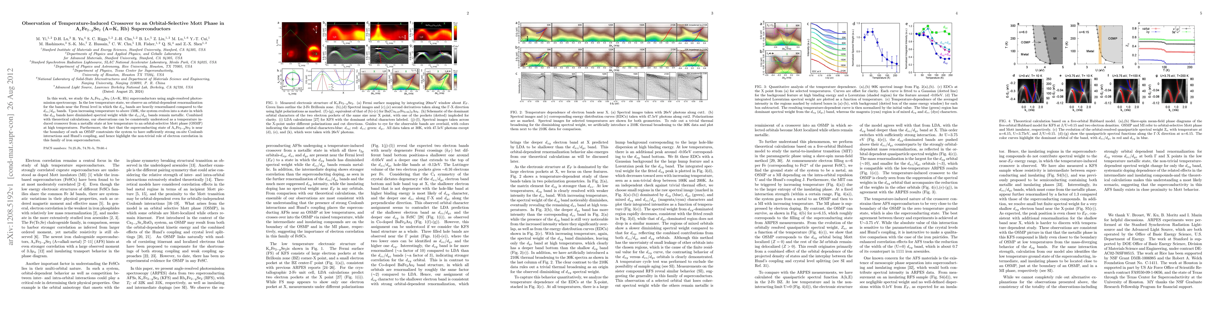 This study reveals a temperature-induced crossover in A$_{x}$Fe$_{2-y}$Se$_2$ superconductors from a metallic state to an orbital-selective Mott phase, observed via angle-resolved photoemission spectroscopy, highlighting the significant role of electron correlation.