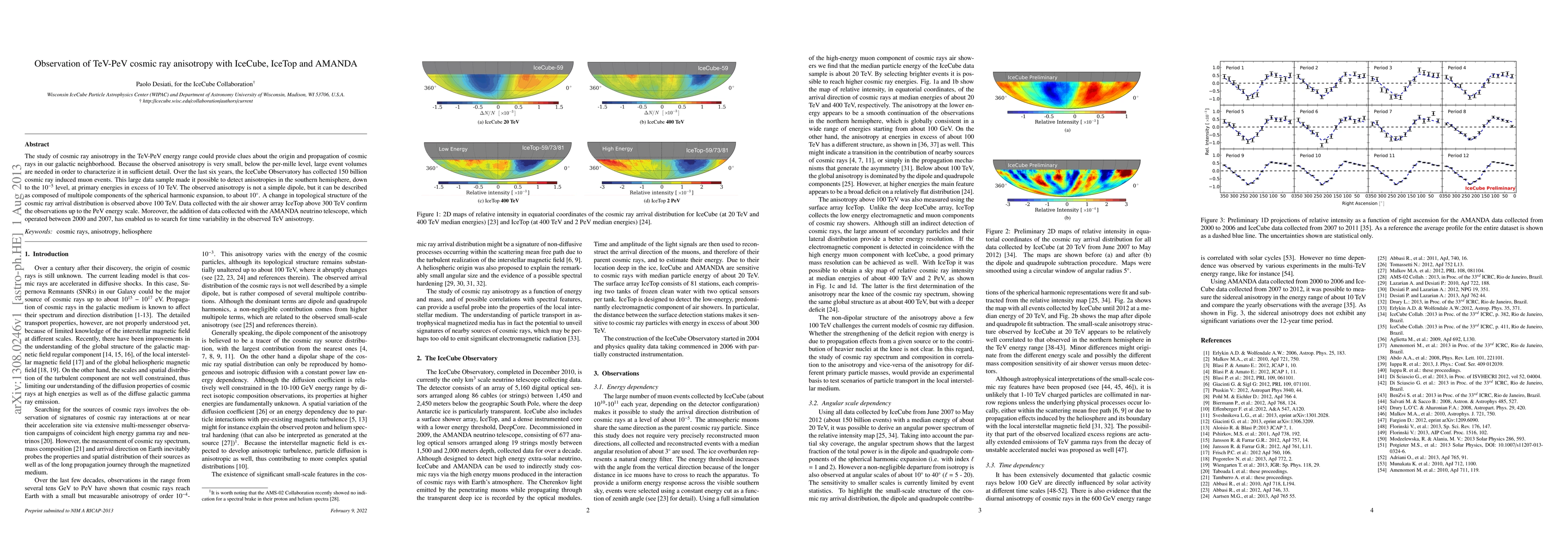 The IceCube Observatory detected TeV-PeV cosmic ray anisotropy in the southern hemisphere, revealing multipole components and a change in arrival distribution above 100 TeV. The study also confirms these findings with IceTop data up to PeV energies and investigates time variability using the AMANDA telescope.