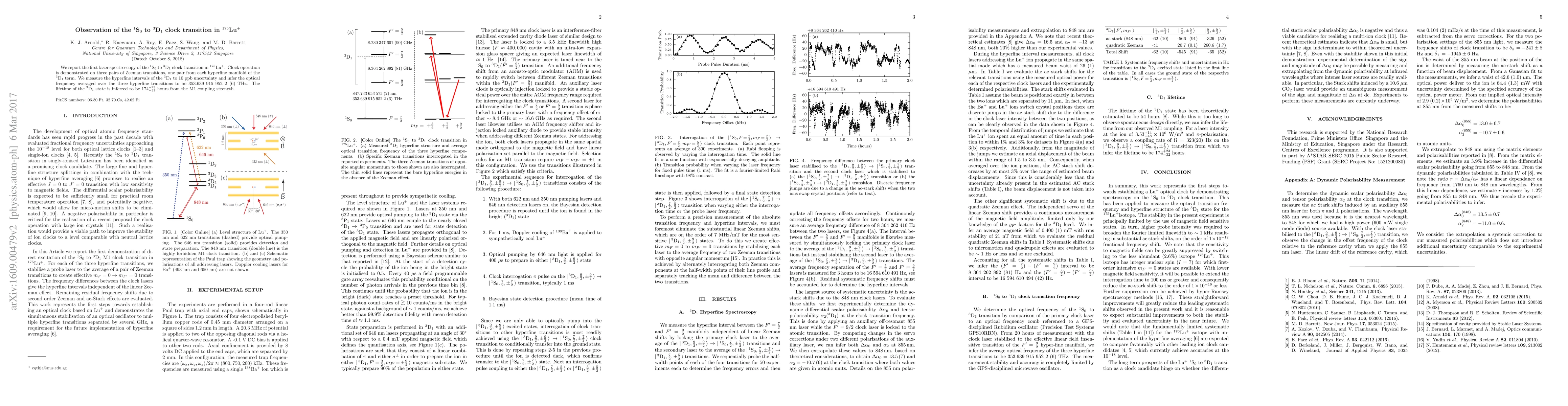 This paper reports the first laser spectroscopy of the $^1$S$_0$ to $^3$D$_1$ clock transition in $^{175}$Lu$^+$, demonstrating clock operation on three Zeeman transition pairs. The hyperfine intervals are measured with 10 ppb uncertainty, and the optical frequency is determined to be 353.639 915 952 2 (6) THz.