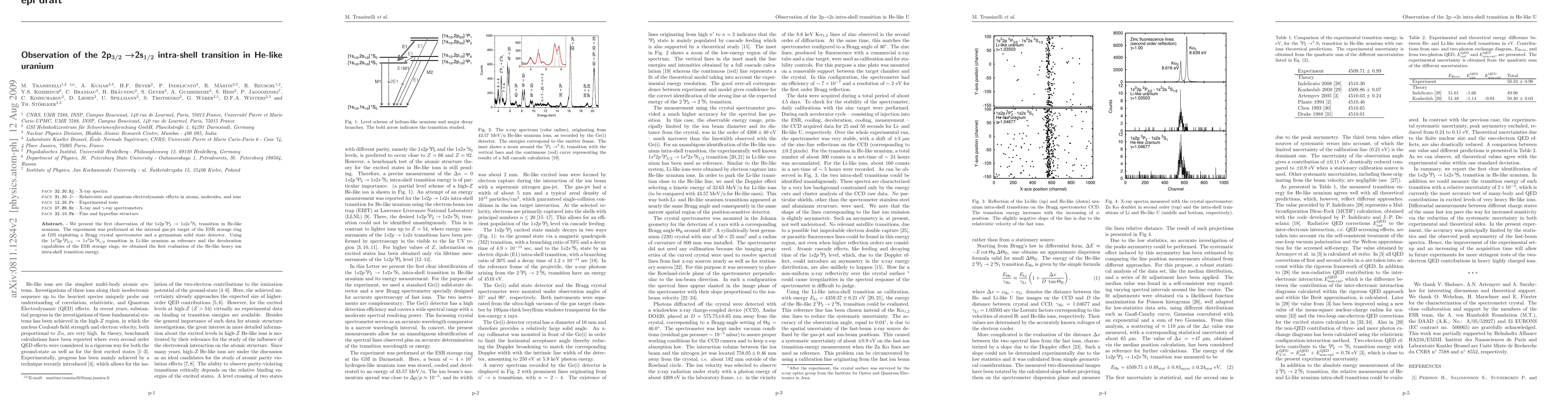 This study reports the first observation of the 1s2p 3P2 → 1s2s 3S1 intra-shell transition in He-like uranium using an internal gas-jet target at the ESR storage ring. The experiment utilized a Bragg crystal spectrometer and a germanium detector to determine the transition energy.