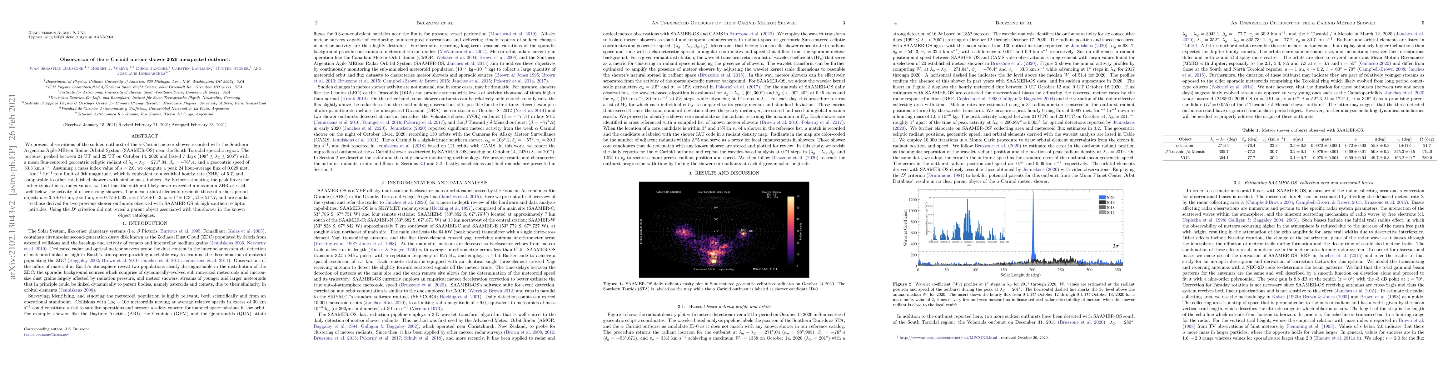 We present observations of the sudden outburst of the $\alpha$ Carinid meteor shower recorded with the Southern Argentina Agile MEteor Radar-Orbital System (SAAMER-OS) near the South Toroidal sporadic region. The outburst peaked between 21 UT and 22 UT on October 14, 2020 and lasted 7 days $(199^{\circ}\leq\lambda_{\odot}\leq 205^{\circ})$ with a mean Sun-centered geocentric ecliptic radiant of $\lambda_{g}-\lambda_{\odot}=271^{\circ}.04$, $\beta_{g}=-76^{\circ}.4$, and a geocentric speed of 33.3 km s$^{-1}$. Assuming a mass index value of $s=2.0$, we compute a peak 24 hour-average flux of 0.029 met. km$^{-2}$ hr$^{-1}$ to a limit of 9th magnitude, which is equivalent to a zenithal hourly rate (ZHR) of 5.7, and comparable to other established showers with similar mass indices. By further estimating the peak fluxes for other typical mass index values, we find that the outburst likely never exceeded a maximum ZHR of $\sim44$, well below the activity of other strong showers. The mean orbital elements resemble those of a short-period object: $a=3.5\pm0.1$ au, $q\simeq 1$ au, $e=0.72\pm0.02$, $i=55^{\circ}.8\pm0^{\circ}.3$, $\omega=1^{\circ}\pm 173^{\circ}$, $\Omega=21^{\circ}.7$, and are similar to those derived for two previous shower outbursts observed with SAAMER-OS at high southern ecliptic latitudes. Using the $D^{\prime}$ criterion did not reveal a parent object associated with this shower in the known object catalogues.