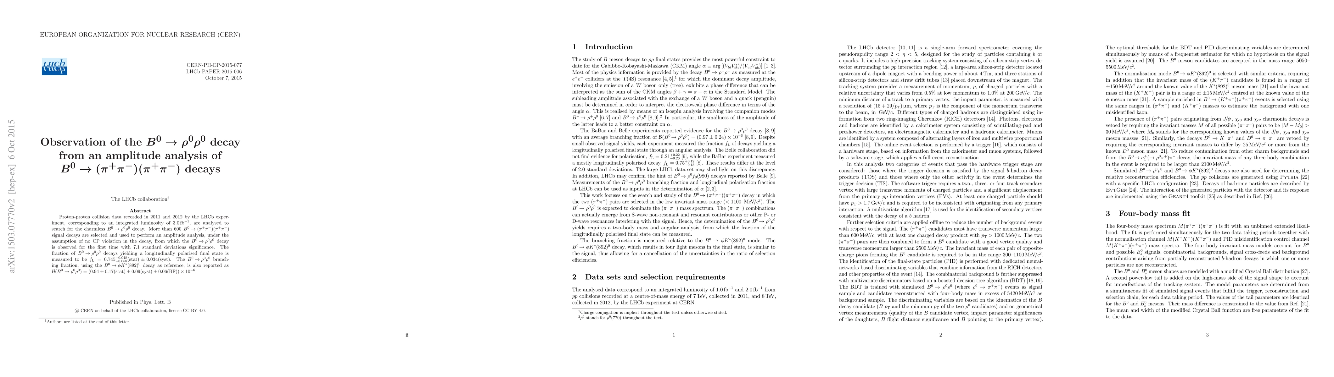 Proton-proton collision data recorded in 2011 and 2012 by the \lhcb experiment, co\-rres\-pon\-ding to an integrated luminosity of 3.0\invfb, are a\-na\-lysed to search for the charmless ${B^0 \to \rho^0 \rho^0}$ decay. More than 600 ${\B^0 \to (\pi^+\pi^-)(\pi^+\pi^-)}$ signal decays are selected and used to perform an amplitude analysis from which the ${B^0 \to \rho^0 \rho^0}$ decay is observed for the first time with 7.1 standard deviations significance. The fraction of ${B^0 \to \rho^0 \rho^0}$ decays yielding a longitudinally polarised final state is measured to be $\fL = 0.745^{+0.048}_{-0.058} ({\rm stat}) \pm 0.034 ({\rm syst})$. The ${B^0 \to \rho^0 \rho^0}$ branching fraction, using the ${\B^0 \to \phi K^*(892)^{0}}$ decay as reference, is also reported as ${\BF(B^0 \to \rho^0 \rho^0) = (0.94 \pm 0.17 ({\rm stat}) \pm 0.09 ({\rm syst}) \pm 0.06 ({\rm BF})) \times 10^{-6}}$.
