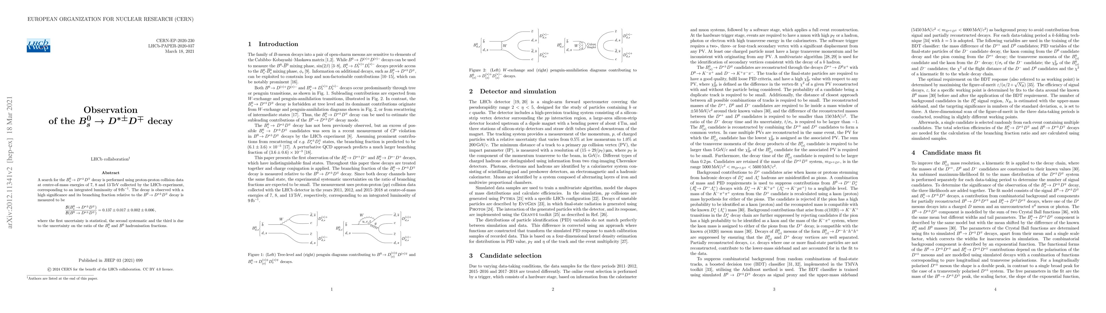 The LHCb experiment observed the $B_s^0 \rightarrow D^{\ast \pm} D^{\mp}$ decay in proton-proton collisions at energies of 7, 8, and 13 TeV, with a high significance. The relative branching fraction to the $B^0 \rightarrow D^{\ast \pm} D^{\mp}$ decay was measured to be 0.137 ± 0.017 ± 0.002 ± 0.006.