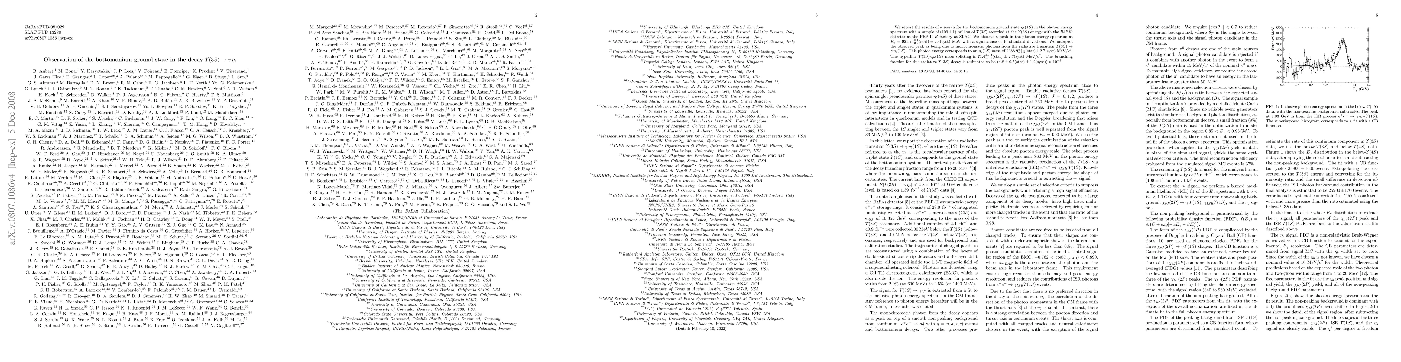 The research observes the bottomonium ground state eta_b(1S) in the decay Upsilon(3S) -> gamma eta_b, finding a peak in the photon energy spectrum at 921.2 MeV with a significance of 10 standard deviations. The corresponding eta_b(1S) mass is measured as 9388.9 MeV/c², and the Upsilon(1S)-eta_b(1S) mass splitting is determined to be 71.4 MeV/c². The branching fraction for this radiative Upsilon(3S) decay is estimated at (4.8 +/- 0.5(stat) +/- 1.2 (syst)) x 10^(-4).