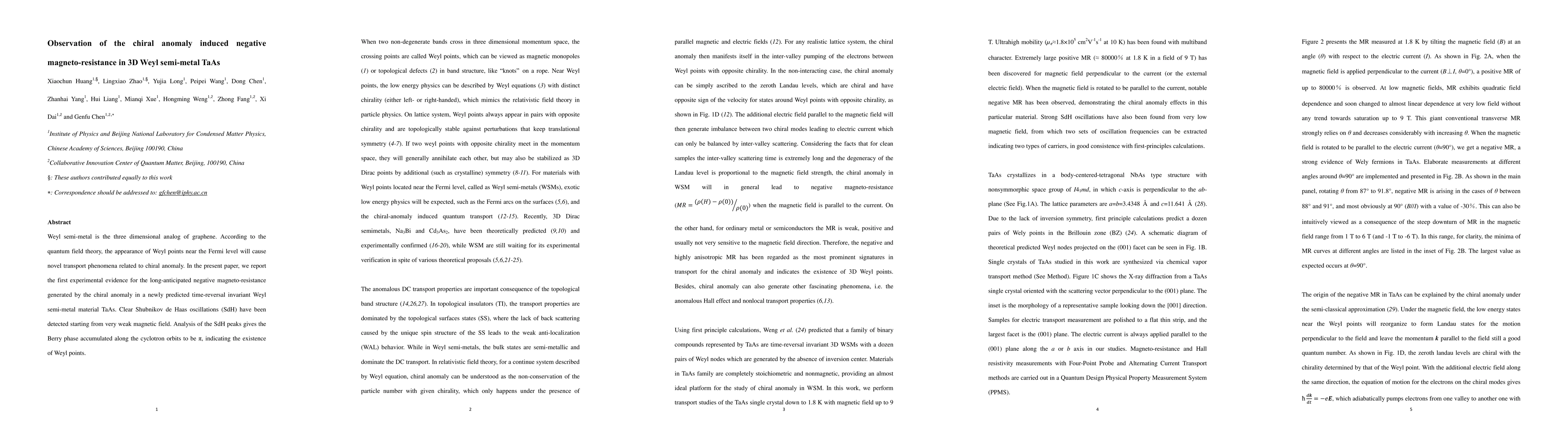 This paper reports the first experimental observation of negative magneto-resistance in the 3D Weyl semi-metal TaAs, attributed to the chiral anomaly near the Fermi level. Clear Shubnikov de Haas oscillations reveal a Berry phase of π, confirming the presence of Weyl points.