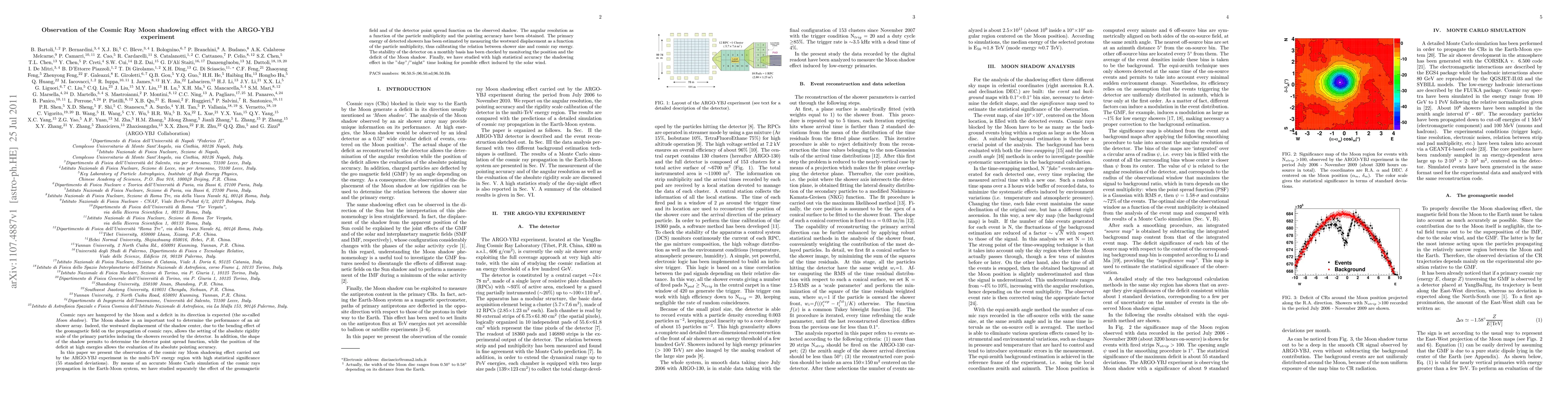This paper reports the observation of the cosmic ray Moon shadowing effect using the ARGO-YBJ experiment, revealing a significant westward displacement of the shadow center due to geomagnetic bending. The study provides insights into the detector's performance, including its angular resolution, pointing accuracy, and stability, and investigates potential solar wind influences on the shadow.