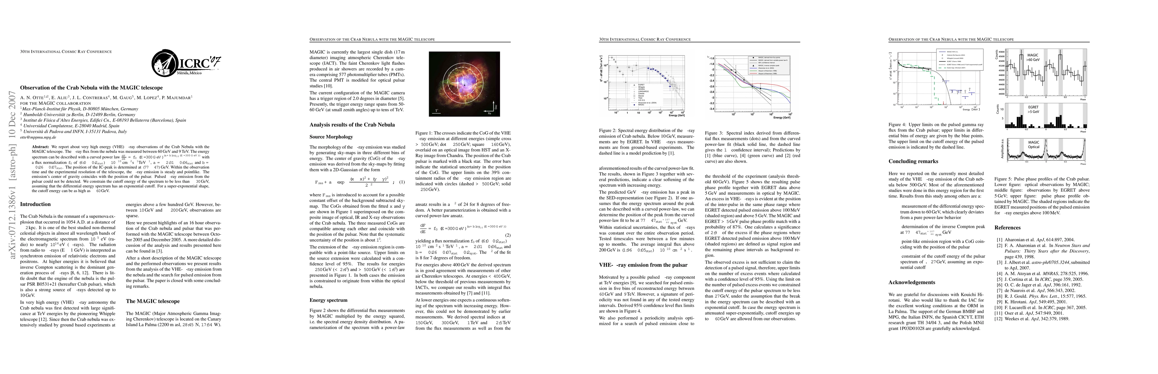 The MAGIC telescope observed the Crab Nebula's very high energy (VHE) gamma-ray flux between 60 GeV and 9 TeV, revealing a steady, pointlike emission with a curved power law spectrum. No pulsed gamma-ray emission from the pulsar was detected, and the spectrum's cutoff energy is constrained to be less than ~30 GeV.
