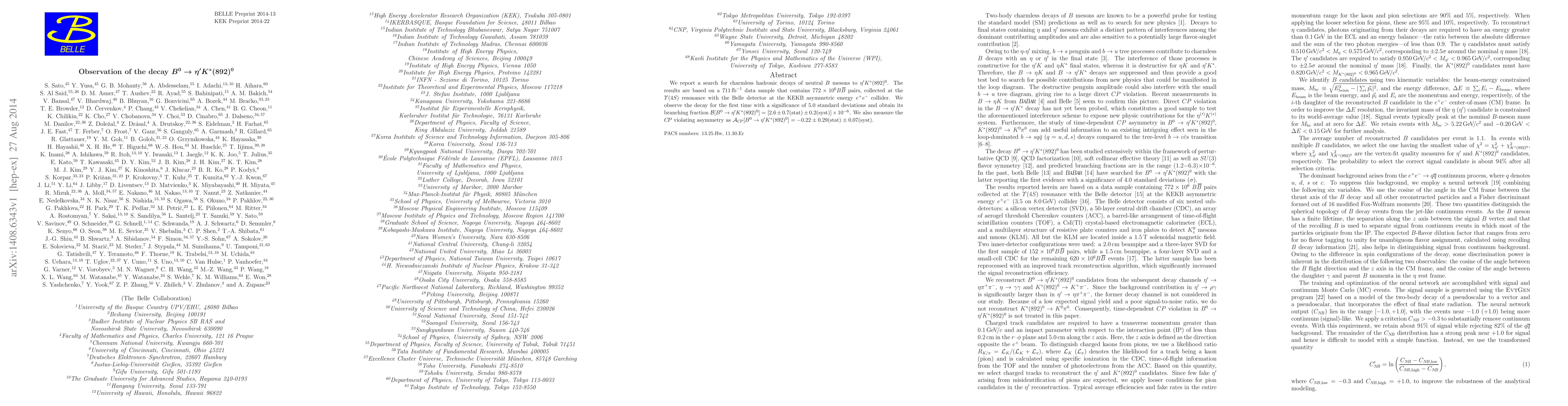 Researchers at Belle detector observe for the first time the charmless hadronic decay $B^0 o au' K^{*}(892)^{0}$ with a significance of 5 standard deviations, yielding a branching fraction of $[2.6 ime 10^{-6}]$. The decay's $CP$-violating asymmetry is measured as ${ m -}0.22$, indicating a significant deviation from the Standard Model.