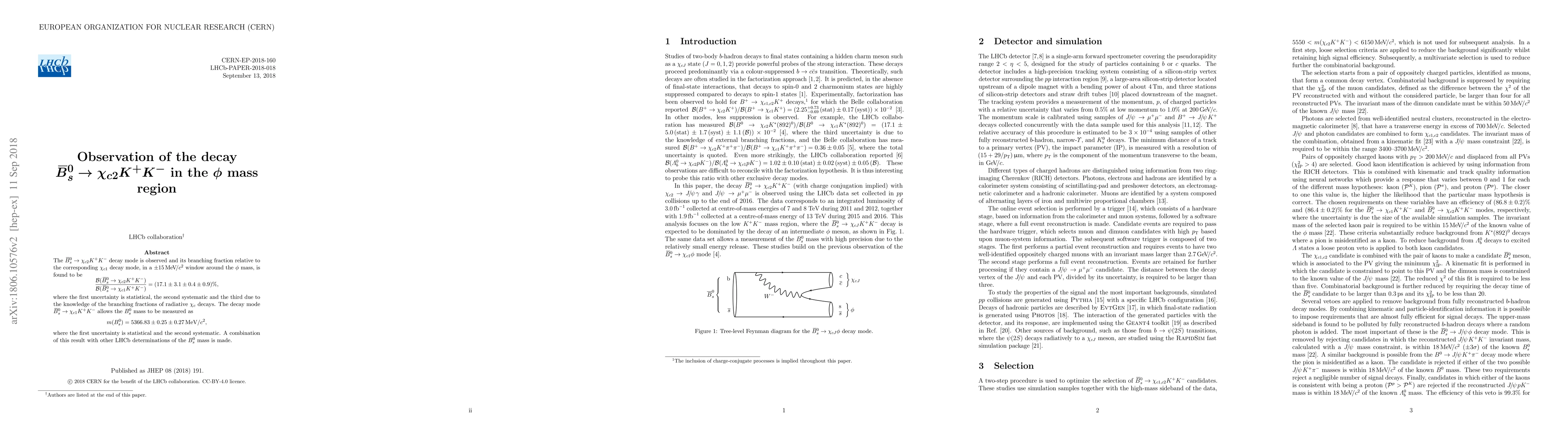 The $\overline{B_s^0} \rightarrow \chi_{c2} K^+ K^- $ decay mode is observed and its branching fraction relative to the corresponding $\chi_{c1}$ decay mode, in a $\pm 15 \textrm{MeV}/c^2$ window around the $\phi$ mass, is found to be $\frac{\mathcal{B}(\overline{B_s^0} \rightarrow \chi_{c2} K^+ K^-) }{ \mathcal{B}(\overline{B_s^0} \rightarrow \chi_{c1} K^+ K^-)} = (17.1 \pm 3.1 \pm 0.4 \pm 0.9)\%,$ where the first uncertainty is statistical, the second systematic and the third due to the knowledge of the branching fractions of radiative $\chi_c$ decays. The decay mode $\overline{B_s^0} \rightarrow \chi_{c1} K^+ K^- $ allows the $ B_s^0$ mass to be measured as $m(B_s^0) = 5366.83 \pm 0.25 \pm 0.27 \, \textrm{MeV}/c^2,$ where the first uncertainty is statistical and the second systematic. A combination of this result with other LHCb determinations of the $B_s^0$ mass is made.