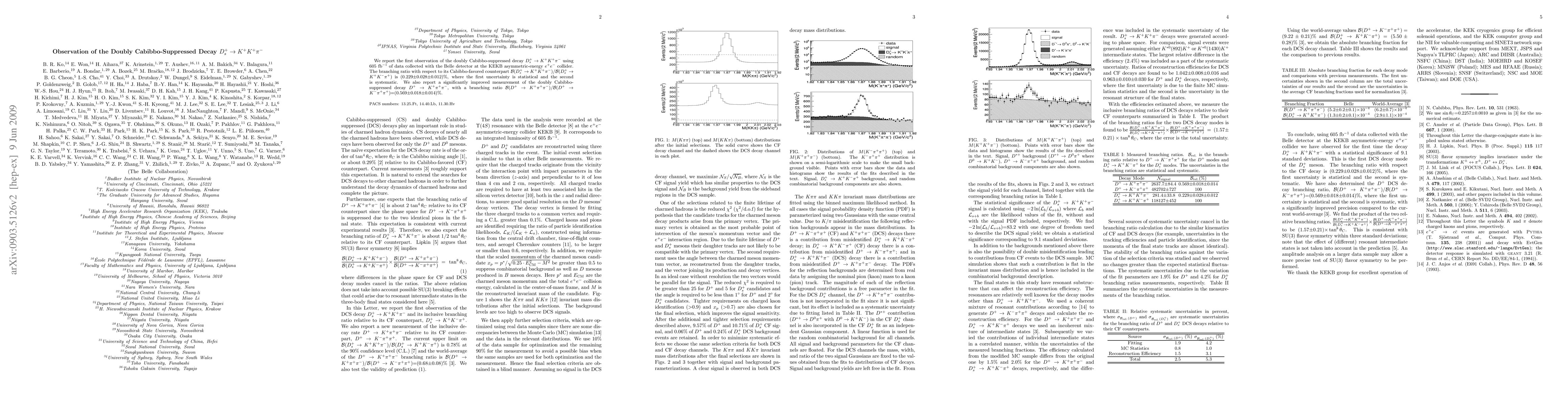We report the first observation of the doubly Cabibbo-suppressed decay $D^+_s\to K^+K^+\pi^-$ using 605 fb$^{-1}$ of data collected with the Belle detector at the KEKB asymmetric-energy $e^+e^-$ collider. The branching ratio with respect to its Cabibbo-favored counterpart $\mathcal{B}(D^+_s\to K^+K^+\pi^-)$ / $\mathcal{B}(D^+_s\to K^+K^-\pi^+)$ is (0.229$\pm0.028\pm$0.012)%, where the first uncertainty is statistical and the second is systematic. We also report a significantly improved measurement of the doubly Cabibbo-suppressed decay $D^+\to K^+\pi^+\pi^-$, with a branching ratio $\mathcal{B}(D^+\to K^+\pi^+\pi^-)$ / $\mathcal{B}(D^+\to K^-\pi^+\pi^+)$=(0.569$\pm0.018\pm$0.014)%.