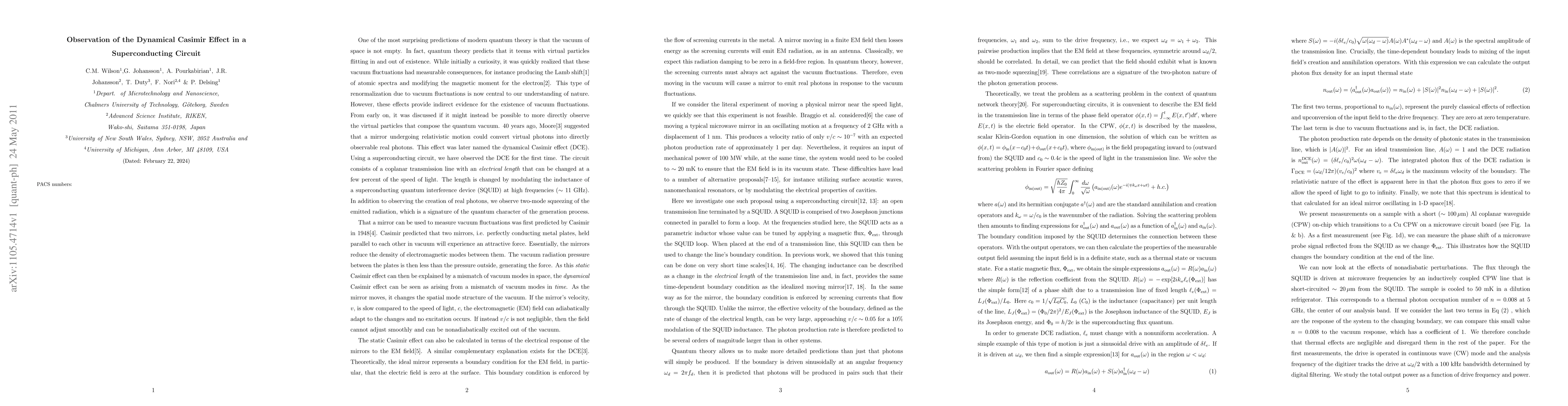This paper reports the first observation of the dynamical Casimir effect in a superconducting circuit, demonstrating the conversion of vacuum fluctuations into real photons as the circuit's length is modulated. The study also reveals two-mode squeezing in the emitted radiation, confirming the quantum nature of the process.