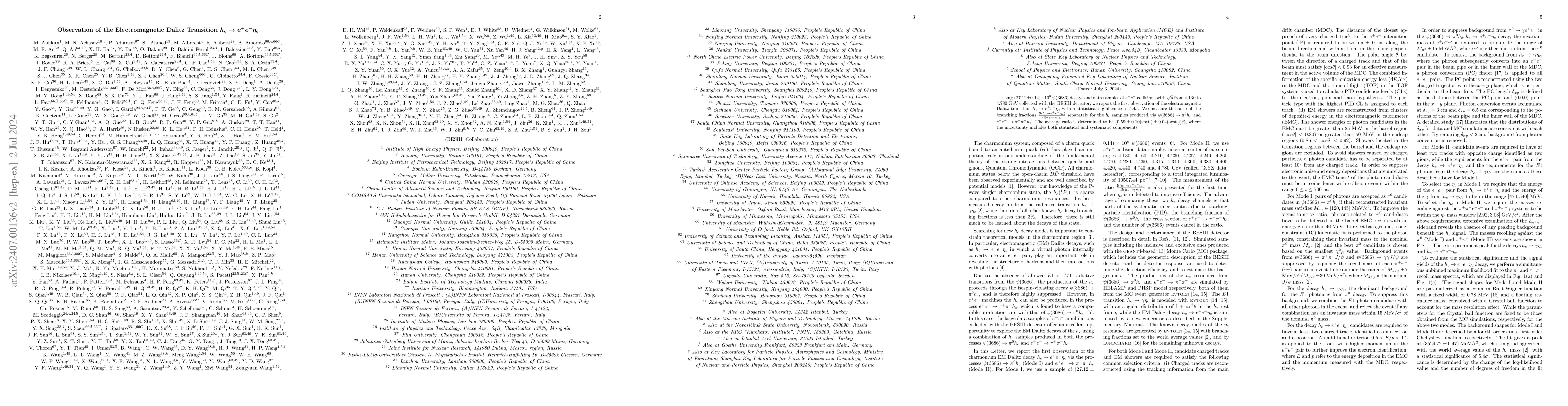 Using $(27.12\pm 0.14)\times10^8$ $\psi(3686)$ decays and data samples of $e^+e^-$ collisions with $\sqrt{s}$ from 4.130 to 4.780~GeV collected with the BESIII detector, we report the first observation of the electromagnetic Dalitz transition $h_c\to e^+e^-\eta_c$ with a statistical significance of $5.4\sigma$. We measure the ratio of the branching fractions $\frac{\mathcal{B}(h_c\rightarrow e^+e^-\eta_c)}{\mathcal{B}(h_c\rightarrow \gamma \eta_c)}$ separately for the $h_c$ samples produced via $\psi(3686)\to\pi^0h_c$ and $e^+e^-\to\pi^+\pi^-h_c$. The average ratio is determined to be $(0.59\pm0.10(\text{stat.})\pm0.04(\text{syst.}))\%$, where the uncertainty includes both statistical and systematic components.