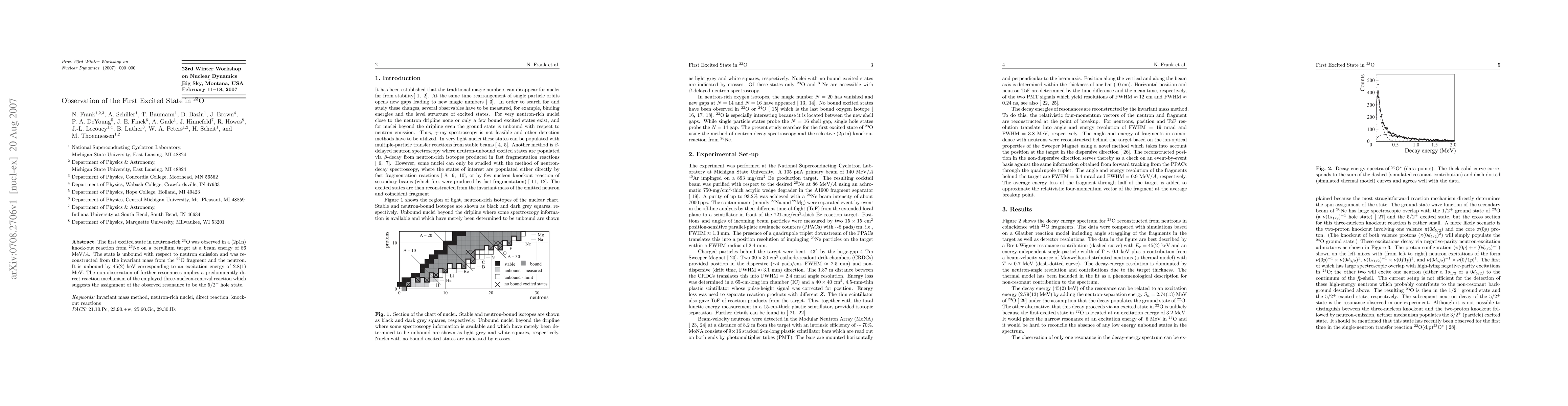 The first excited state in neutron-rich 23O was observed in a (2p1n) knock-out reaction from 26Ne on a beryllium target at a beam energy of 86 MeV/A. The state is unbound with respect to neutron emission and was reconstructed from the invariant mass from the 22O fragment and the neutron. It is unbound by 45(2) keV corresponding to an excitation energy of 2.8(1) MeV. The non-observation of further resonances implies a predominantly direct reaction mechanism of the employed three-nucleon-removal reaction which suggests the assignment of the observed resonance to be the 5/2+ hole state.
