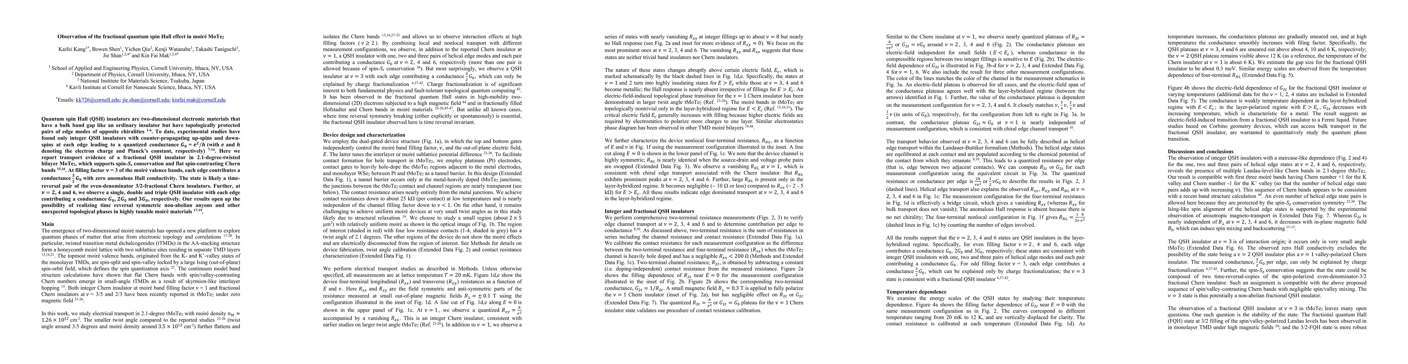 This paper reports the observation of a fractional quantum spin Hall effect in twisted bilayer MoTe2, demonstrating quantized conductances of 3/2 G0, G0, 2G0, and 3G0 at filling factors v = 3, 2, 4, and 6 respectively, suggesting the presence of non-abelian anyons and new topological phases in moiré materials.