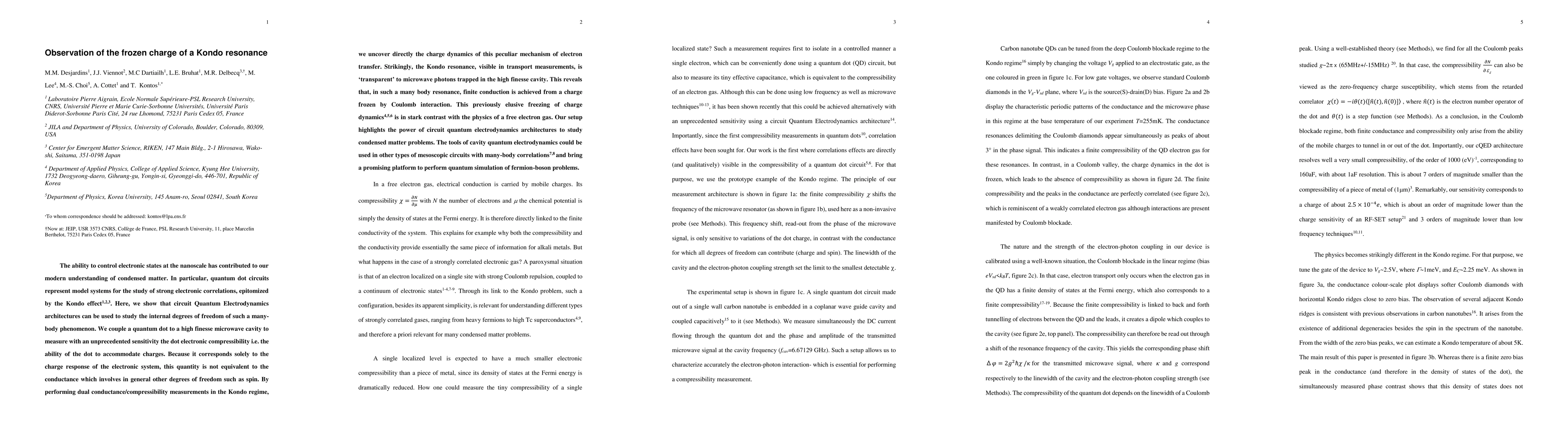 The ability to control electronic states at the nanoscale has contributed to our modern understanding of condensed matter. In particular, quantum dot circuits represent model systems for the study of strong electronic correlations, epitomized by the Kondo effect. Here, we show that circuit Quantum Electrodynamics architectures can be used to study the internal degrees of freedom of such a many-body phenomenon. We couple a quantum dot to a high finesse microwave cavity to measure with an unprecedented sensitivity the dot electronic compressibility i.e. the ability of the dot to accommodate charges. Because it corresponds solely to the charge response of the electronic system, this quantity is not equivalent to the conductance which involves in general other degrees of freedom such as spin. By performing dual conductance/compressibility measurements in the Kondo regime, we uncover directly the charge dynamics of this peculiar mechanism of electron transfer. Strikingly, the Kondo resonance, visible in transport measurements, is transparent to microwave photons trapped in the high finesse cavity. This reveals that, in such a many body resonance, finite conduction is achieved from a charge frozen by Coulomb interaction. This previously elusive freezing of charge dynamics is in stark contrast with the physics of a free electron gas. Our setup highlights the power of circuit quantum electrodynamics architectures to study condensed matter problems. The tools of cavity quantum electrodynamics could be used in other types of mesoscopic circuits with many-body correlations and bring a promising platform to perform quantum simulation of fermion-boson problems.