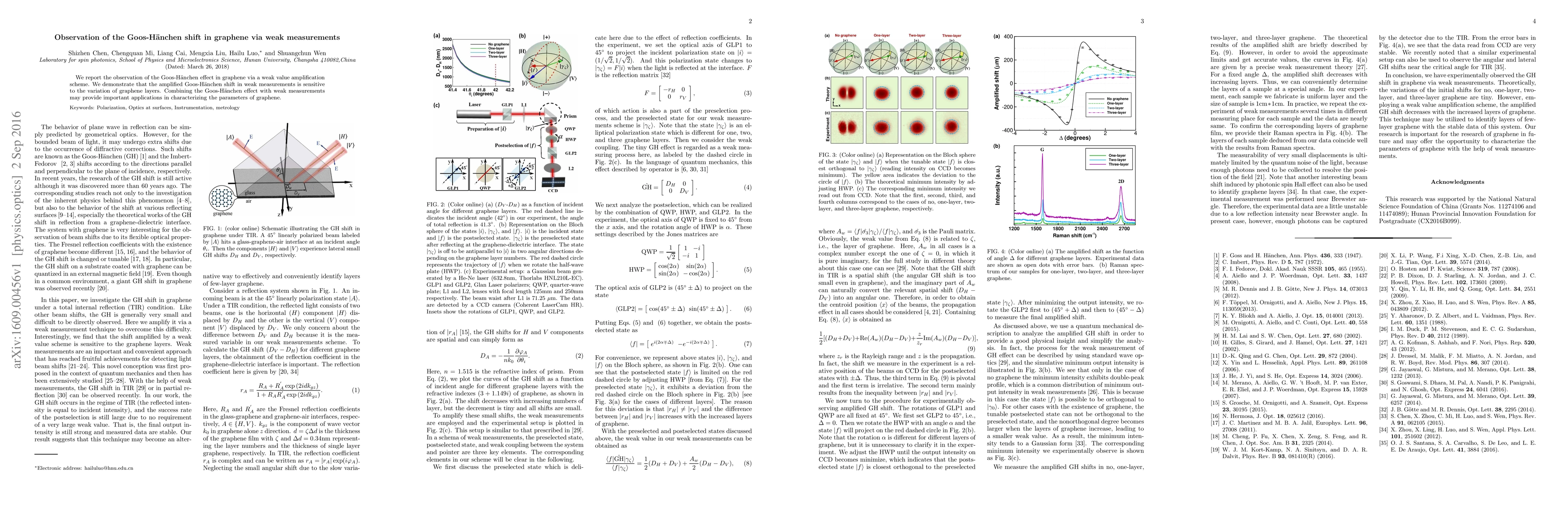 The paper reports the observation of the Goos-Hänchen effect in graphene using weak value amplification, revealing that this effect is sensitive to variations in graphene layers, which may aid in parameter characterization. The study combines weak measurements with the Goos-Hänchen effect for potential applications in graphene analysis.