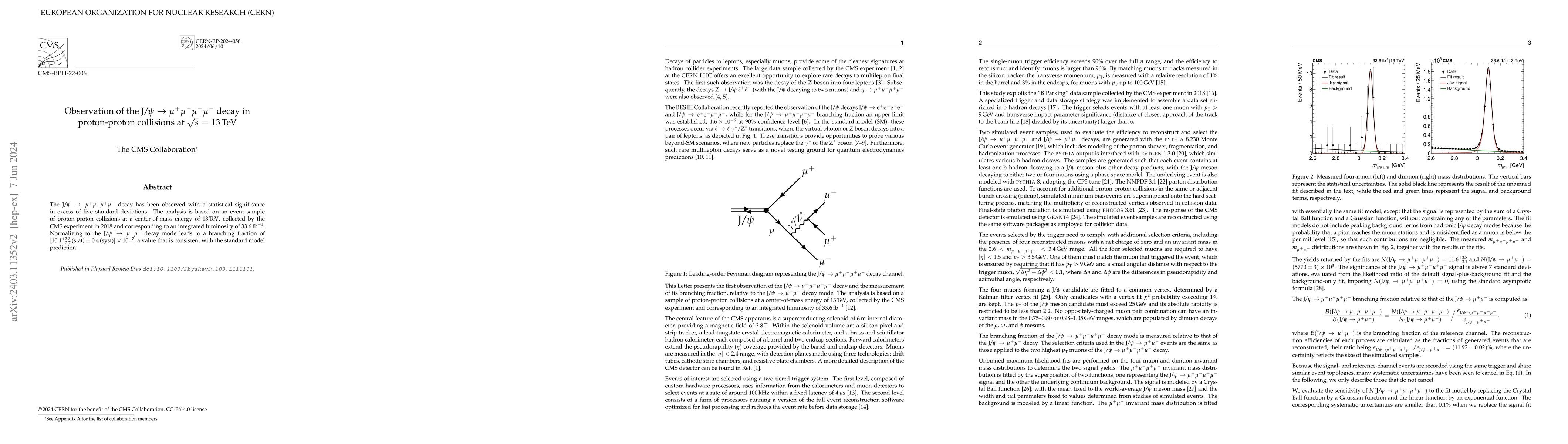 The CMS experiment observed the rare J/$\psi$ $\to$ $\mu^+\mu^-\mu^+\mu^-$ decay in proton-proton collisions at 13 TeV with a statistical significance exceeding five standard deviations. The branching fraction is consistent with standard model predictions at [10.1 $^{+3.3}_{-2.7}$ (stat) $\pm$ 0.4 (syst)] $\times$ 10$^{-7}$.