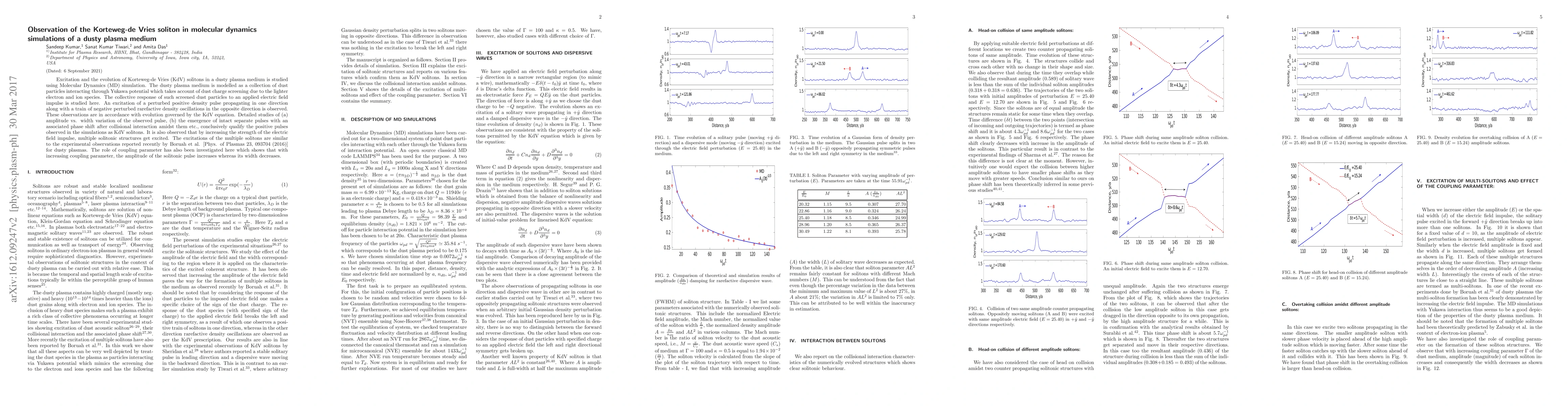 This paper investigates the formation and behavior of Korteweg-de Vries (KdV) solitons in dusty plasmas using molecular dynamics simulations. The study confirms the existence of KdV solitons through the observed amplitude vs. width variations and their collisional interactions, and notes the effect of electric field strength and coupling parameters on soliton characteristics.