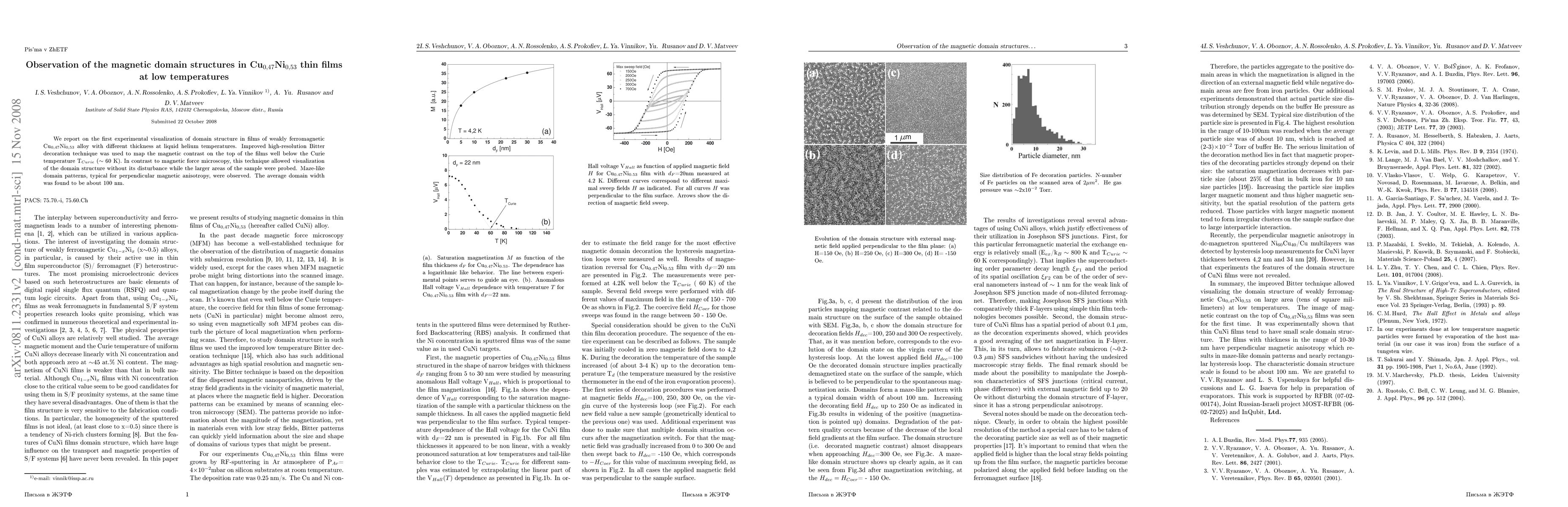 We report on the first experimental visualization of domain structure in films of weakly ferromagnetic Cu$_{0,47}$Ni$_{0,53}$ alloy with different thickness at liquid helium temperatures. Improved high-resolution Bitter decoration technique was used to map the magnetic contrast on the top of the films well below the Curie temperature T$_{Curie}$ ($\sim$ 60 K). In contrast to magnetic force microscopy, this technique allowed visualization of the domain structure without its disturbance while the larger areas of the sample were probed. Maze-like domain patterns, typical for perpendicular magnetic anisotropy, were observed. The average domain width was found to be about 100 nm.
