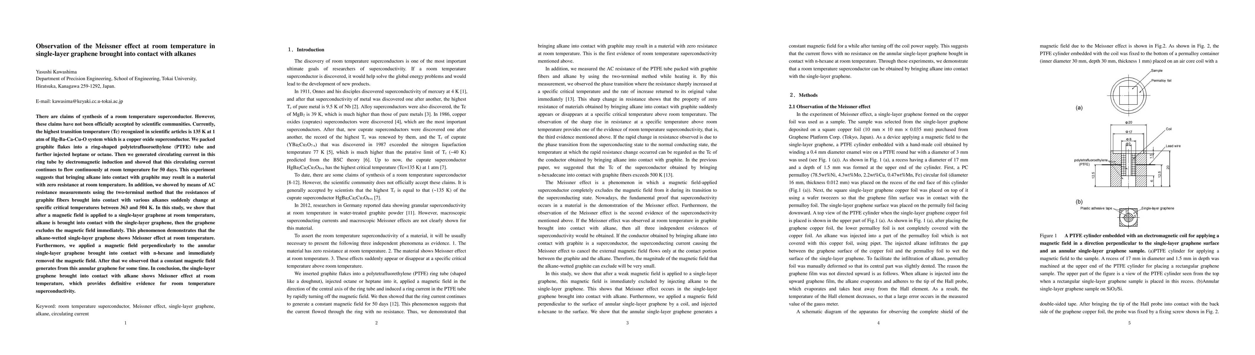 Researchers observed a Meissner effect at room temperature in single-layer graphene brought into contact with alkanes, providing definitive evidence for room temperature superconductivity. The experiment showed that the graphene exhibited zero resistance at room temperature after being exposed to alkane.