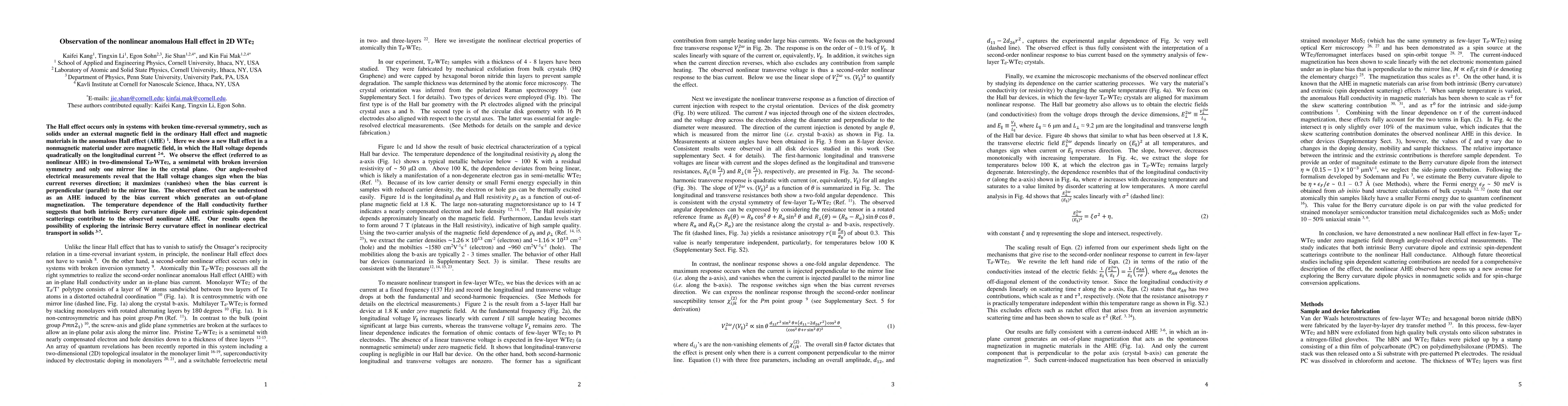 Researchers observed a nonlinear anomalous Hall effect in 2D Td-WTe2, a nonmagnetic material, where the Hall voltage depends on the longitudinal current under zero magnetic field.