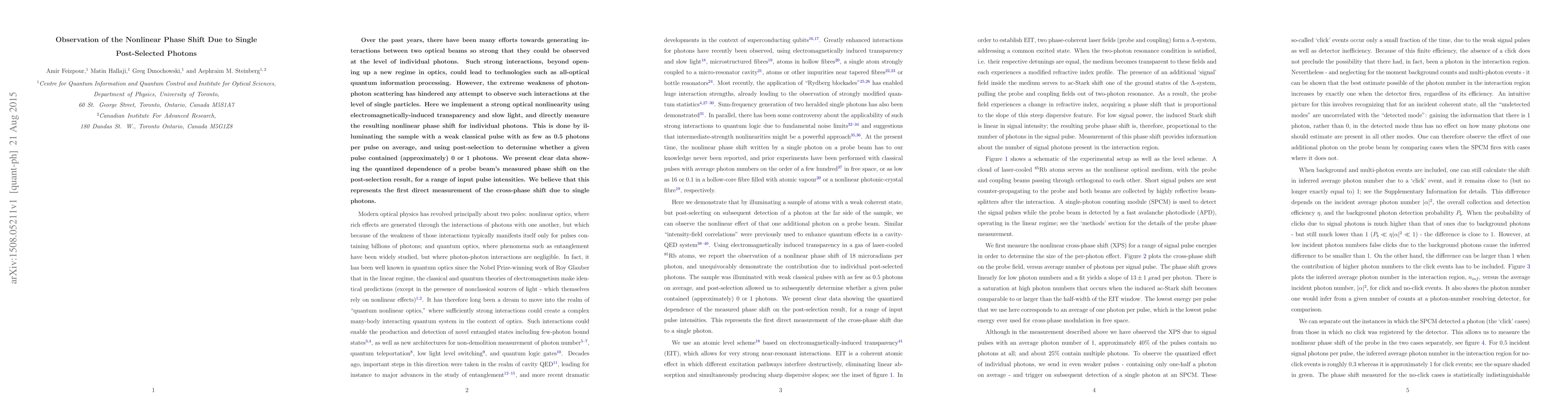 This paper reports the first direct observation of nonlinear phase shifts caused by single post-selected photons using electromagnetically-induced transparency and slow light. The study demonstrates quantized phase shifts in a probe beam, indicating strong photon-photon interactions at the single-photon level.
