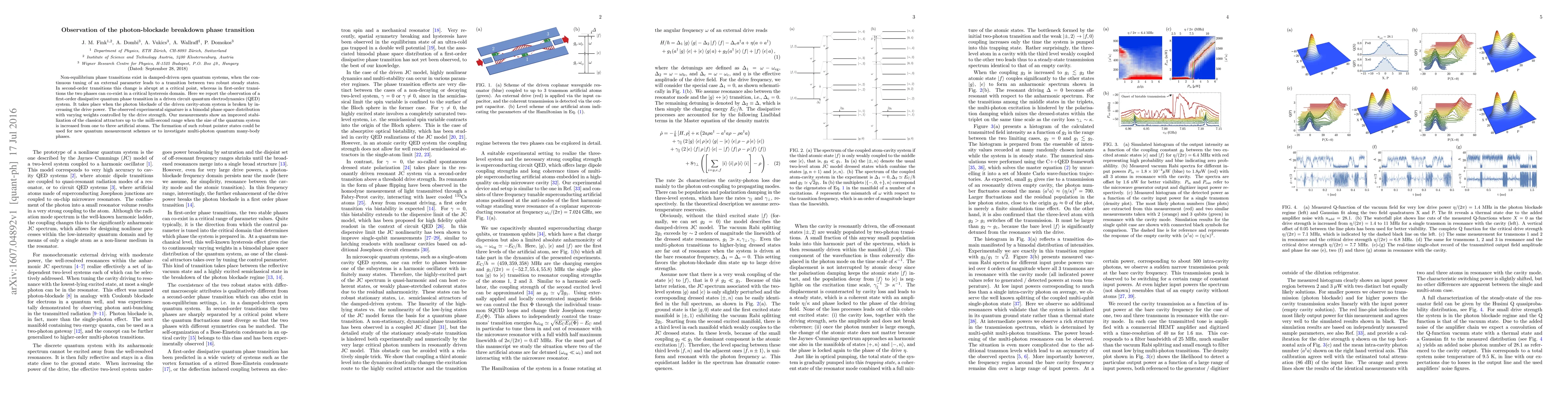 This paper reports the observation of a first-order dissipative quantum phase transition in a driven circuit QED system, where increasing drive power breaks photon blockade, leading to a bimodal phase space distribution. The study highlights improved stabilization of classical attractors in larger quantum systems, suggesting potential applications in quantum measurement and many-body phases.