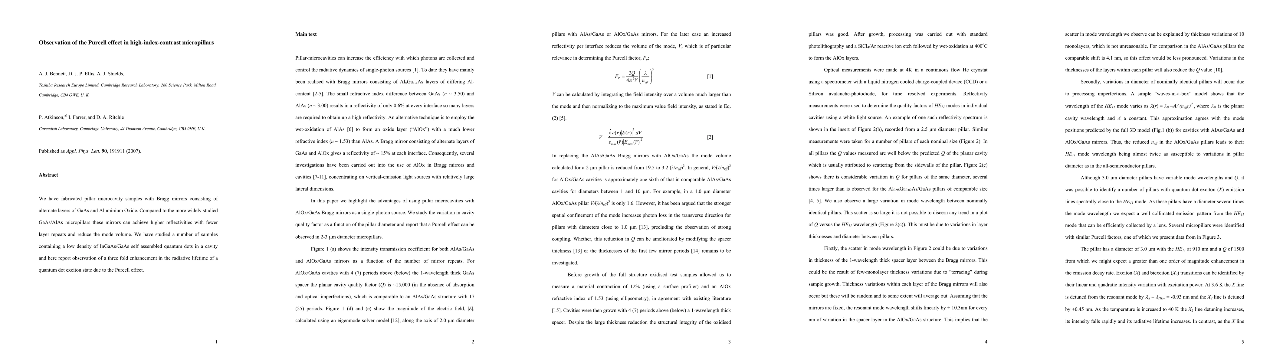 We have fabricated pillar microcavity samples with Bragg mirrors consisting of alternate layers of GaAs and Aluminium Oxide. Compared to the more widely studied GaAs/AlAs micropillars these mirrors can achieve higher reflectivities with fewer layer repeats and reduce the mode volume. We have studied a number of samples containing a low density of InGaAs/GaAs self assembled quantum dots in a cavity and here report observation of a three fold enhancement in the radiative lifetime of a quantum dot exciton state due to the Purcell effect.