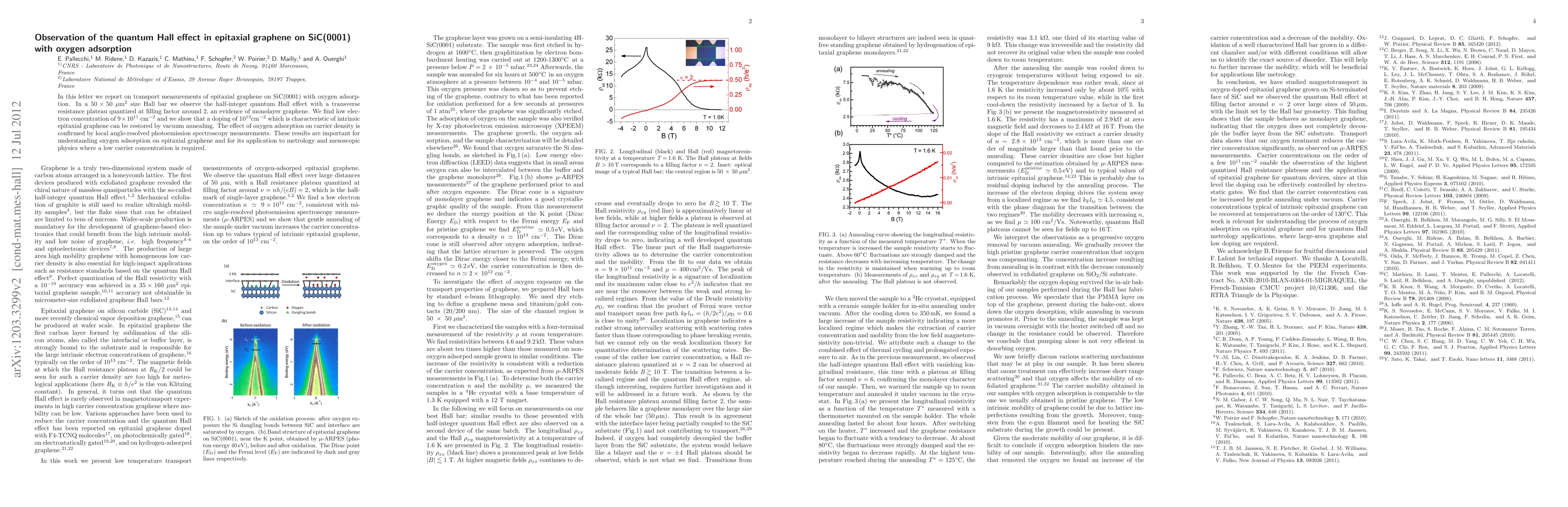 This study observes the half-integer quantum Hall effect in epitaxial graphene on SiC(0001) under oxygen adsorption, indicating monolayer graphene and a low electron concentration. Oxygen adsorption impacts carrier density, which can be reversed by vacuum annealing, highlighting implications for metrology and mesoscopic physics.