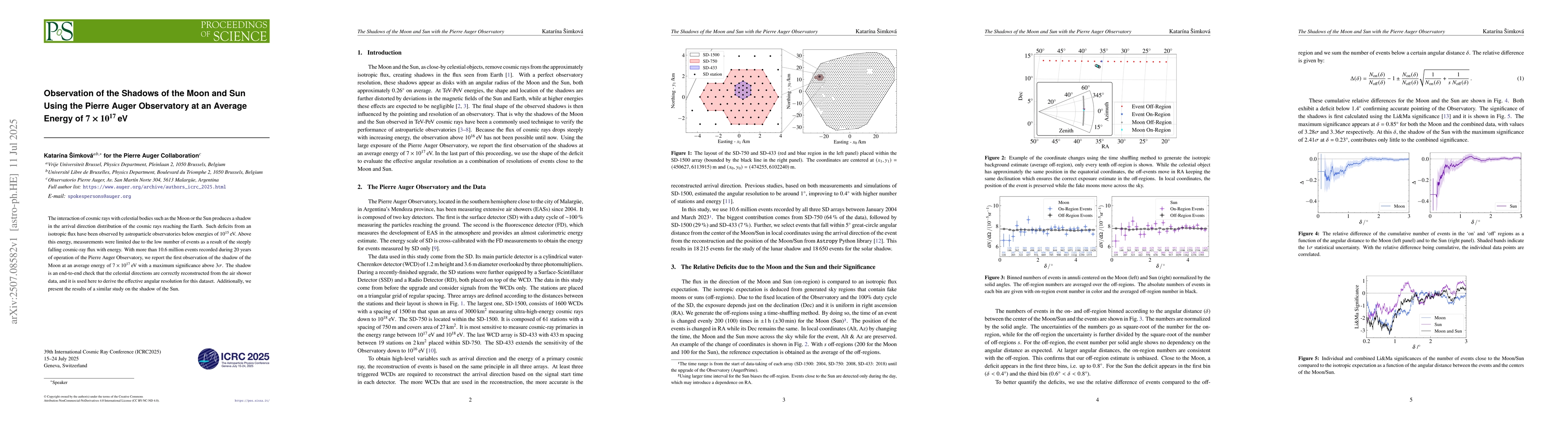 The interaction of cosmic rays with celestial bodies such as the Moon or the Sun produces a shadow in the arrival direction distribution of the cosmic rays reaching the Earth. Such deficits from an isotropic flux have been observed by astroparticle observatories below energies of $10^{15}\,$eV. Above this energy, measurements were limited due to the low number of events as a result of the steeply falling cosmic-ray flux with energy. With more than 10.6 million events recorded during 20 years of operation of the Pierre Auger Observatory, we report the first observation of the shadow of the Moon at an average energy of $7\times10^{17}\,$eV with a maximum significance above 3$\sigma$. The shadow is an end-to-end check that the celestial directions are correctly reconstructed from the air shower data, and it is used here to derive the effective angular resolution for this dataset. Additionally, we present the results of a similar study on the shadow of the Sun.