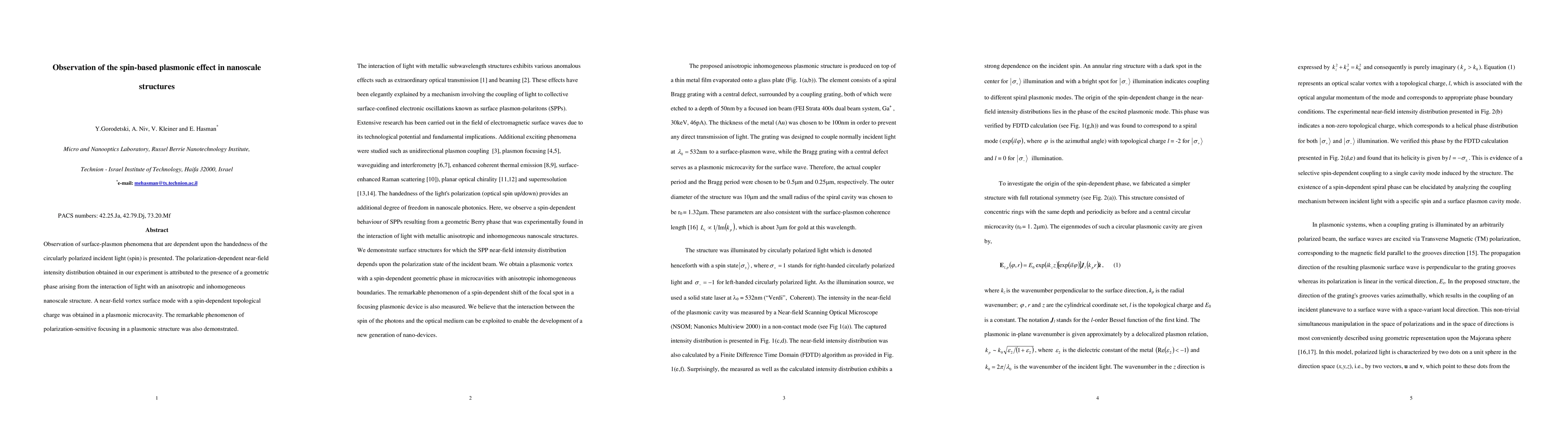 The paper presents a novel approach to observing and utilizing the spin-based plasmonic effect in nanoscale structures, demonstrating a geometric phase arising from the interaction of light with anisotropic and inhomogeneous structures.