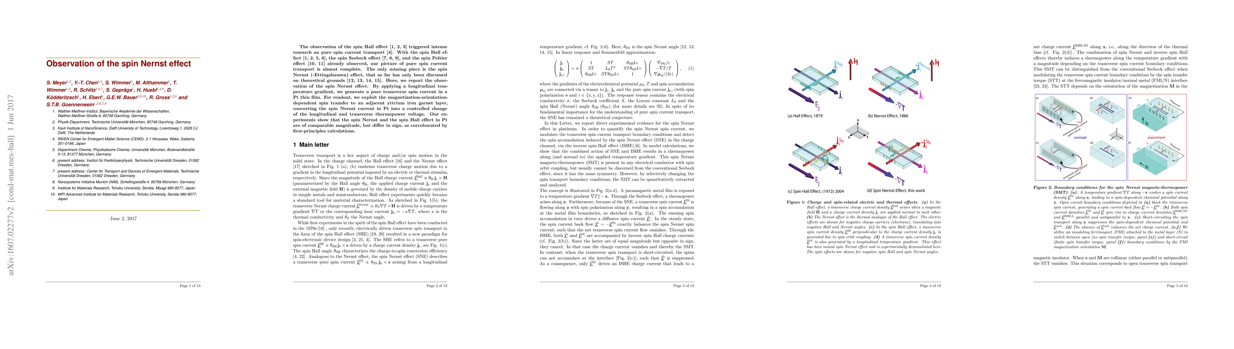 The observation of the spin Hall effect triggered intense research on pure spin current transport. With the spin Hall effect, the spin Seebeck effect, and the spin Peltier effect already observed, our picture of pure spin current transport is almost complete. The only missing piece is the spin Nernst (-Ettingshausen) effect, that so far has only been discussed on theoretical grounds. Here, we report the observation of the spin Nernst effect. By applying a longitudinal temperature gradient, we generate a pure transverse spin current in a Pt thin film. For readout, we exploit the magnetization-orientation-dependent spin transfer to an adjacent Yttrium Iron Garnet layer, converting the spin Nernst current in Pt into a controlled change of the longitudinal thermopower voltage. Our experiments show that the spin Nernst and the spin Hall effect in Pt are of comparable magnitude, but differ in sign, as corroborated by first-principles calculations.