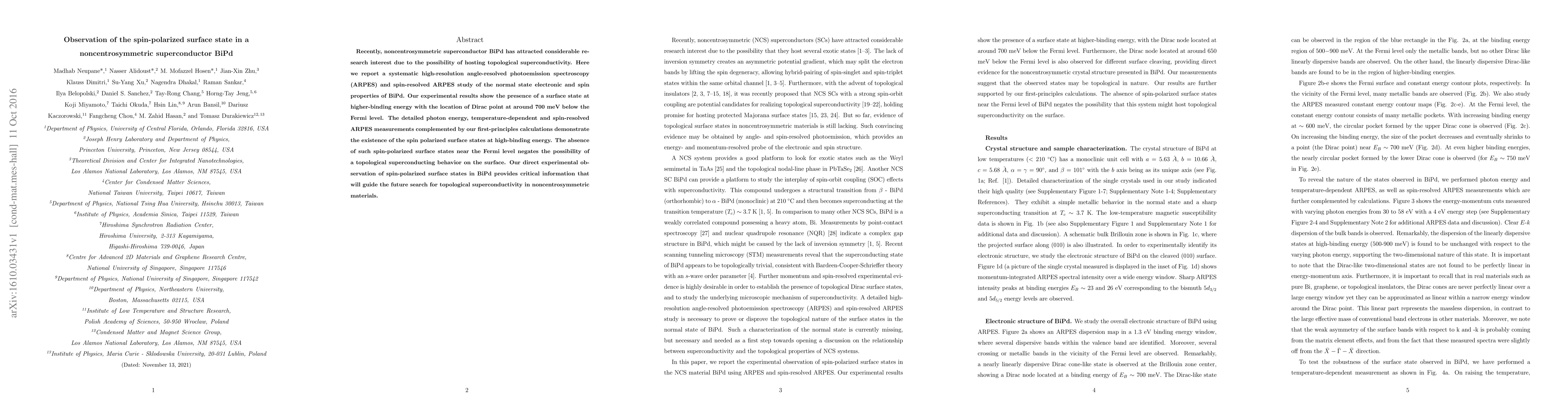 This paper reports high-resolution ARPES studies revealing spin-polarized surface states in noncentrosymmetric superconductor BiPd, negating topological superconductivity on the surface. The findings provide crucial insights for future research into topological superconductivity in similar materials.