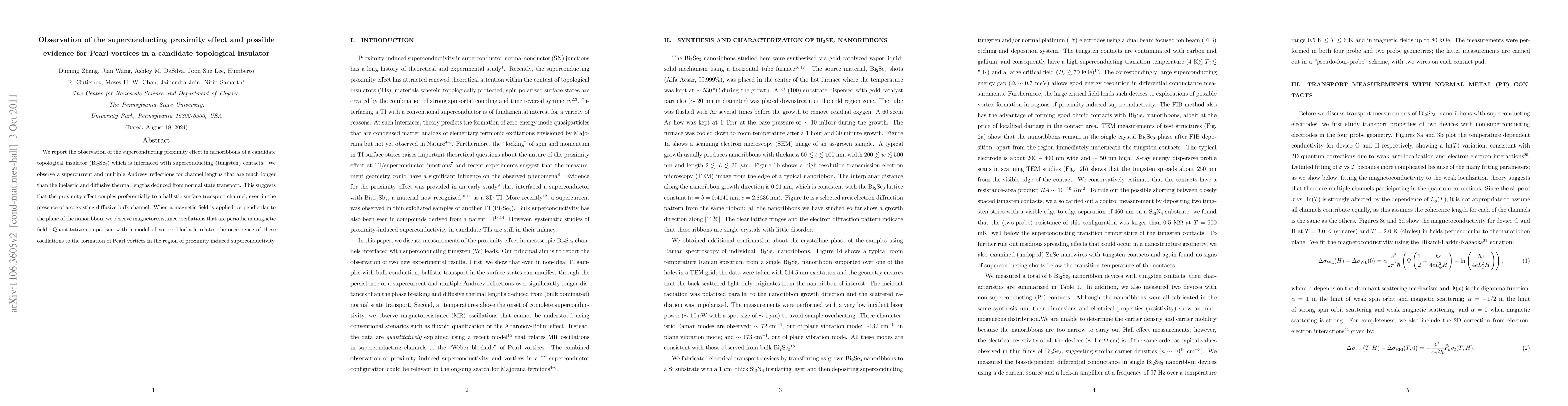We report the observation of the superconducting proximity effect in nanoribbons of a candidate topological insulator (Bi2Se3) which is interfaced with superconducting (tungsten) contacts. We observe a supercurrent and multiple Andreev reflections for channel lengths that are much longer than the inelastic and diffusive thermal lengths deduced from normal state transport. This suggests that the proximity effect couples preferentially to a ballistic surface transport channel, even in the presence of a coexisting diffusive bulk channel. When a magnetic field is applied perpendicular to the plane of the nanoribbon, we observe magnetoresistance oscillations that are periodic in magnetic field. Quantitative comparison with a model of vortex blockade relates the occurrence of these oscillations to the formation of Pearl vortices in the region of proximity induced superconductivity.