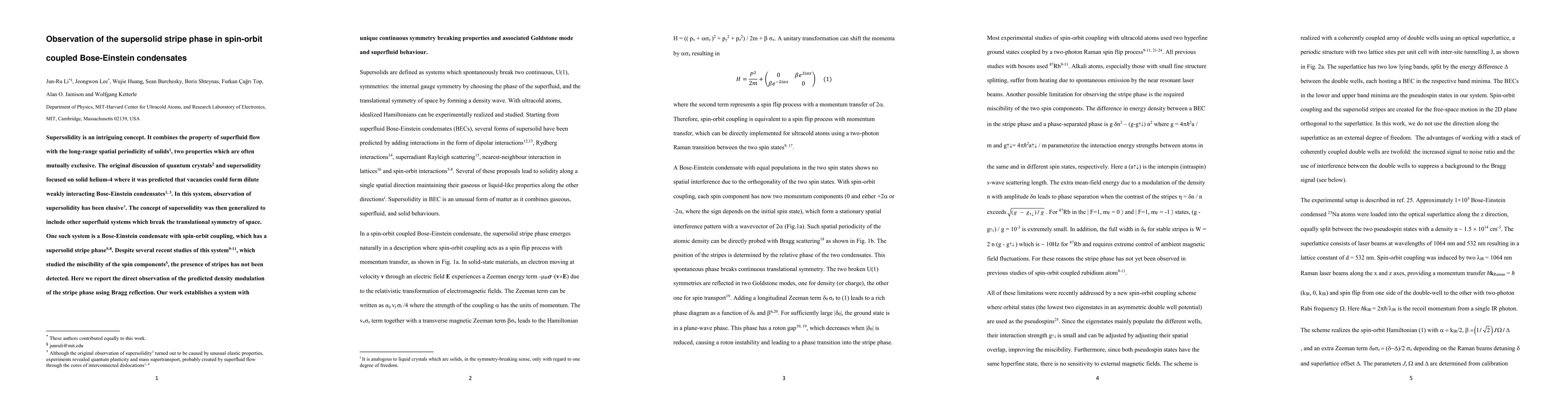This paper reports the first direct observation of the supersolid stripe phase in spin-orbit coupled Bose-Einstein condensates using Bragg reflection, establishing a system with unique symmetry breaking properties. Future research may explore further symmetry breaking through vortices, solitons, impurities, or disorder.