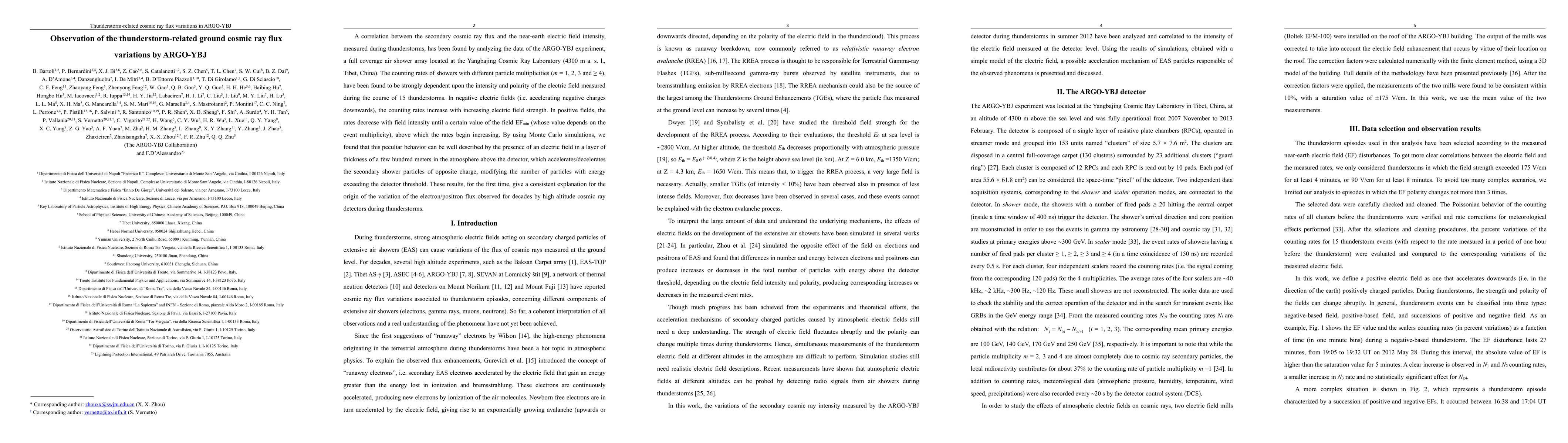 The ARGO-YBJ experiment detected variations in secondary cosmic ray flux correlated with near-Earth electric fields during thunderstorms, showing increased counting rates in negative fields and a complex response in positive fields. Monte Carlo simulations suggest these variations are due to atmospheric electric fields modifying secondary shower particles.