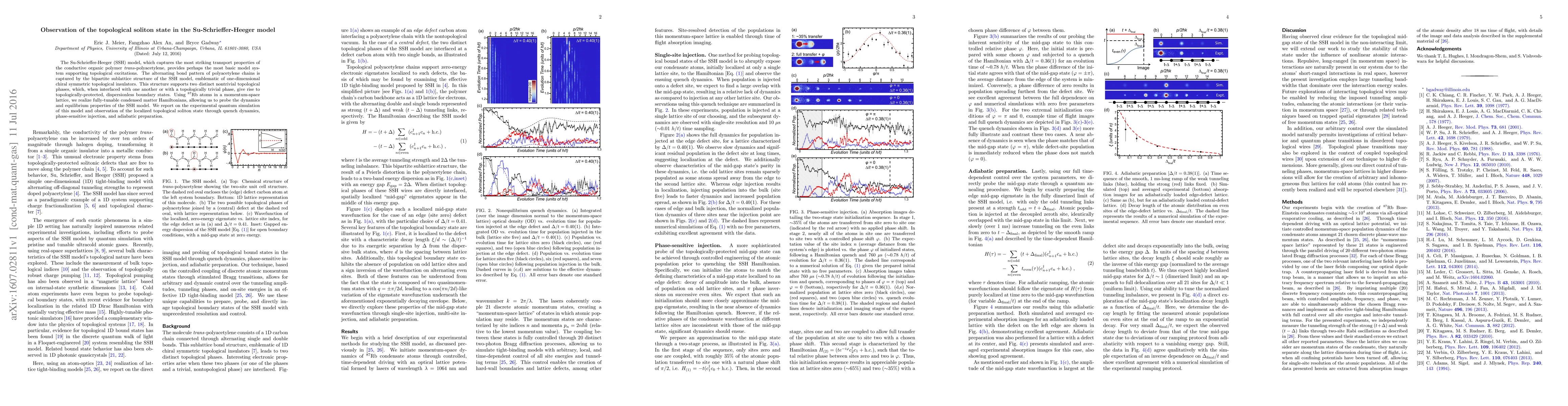 This paper reports the experimental quantum simulation of the Su-Schrieffer-Heeger (SSH) model using $^{87}$Rb atoms, observing the topological soliton state through quench dynamics, phase-sensitive injection, and adiabatic preparation. The study highlights the model's ability to support topologically-protected, dispersionless boundary states.