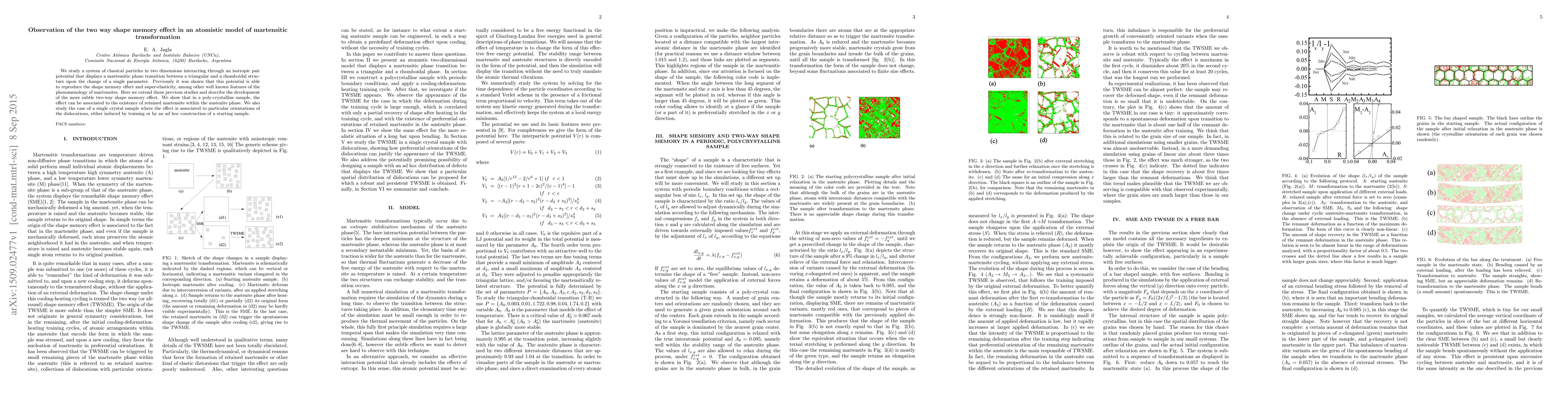 We study a system of classical particles in two dimensions interacting through an isotropic pair potential that displays a martensitic phase transition between a triangular and a rhomboidal structure upon the change of a single parameter. Previously it was shown that this potential is able to reproduce the shape memory effect and super-elasticity, among other well known features of the phenomenology of martensites. Here we extend those previous studies and describe the development of the more subtle two-way shape memory effect. We show that in a poly-crystalline sample, the effect can be associated to the existence of retained martensite within the austenite phase. We also study the case of a single crystal sample where the effect is associated to particular orientations of the dislocations, either induced by training or by an ad hoc construction of a starting sample.