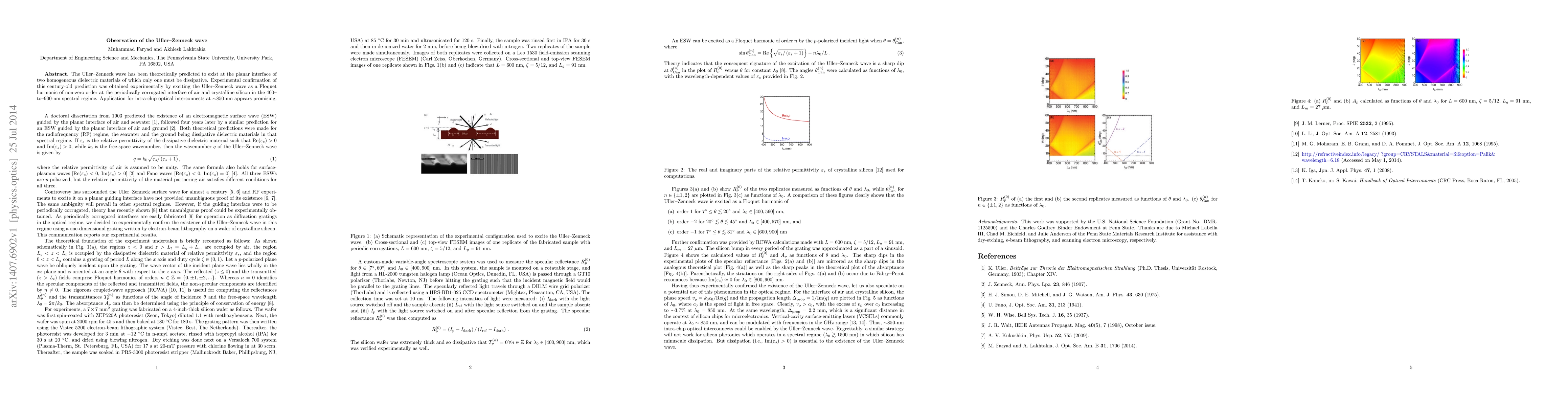 The Uller-Zenneck wave has been theoretically predicted to exist at the planar interface of two homogeneous dielectric materials of which only one must be dissipative. Experimental confirmation of this century-old prediction was obtained experimentally by exciting the Uller-Zenneck wave as a Floquet harmonic of non-zero order at the periodically corrugated interface of air and crystalline silicon in the 400-to-900-nm spectral regime. Application for intra-chip optical interconnects at ~850 nm appears promising.