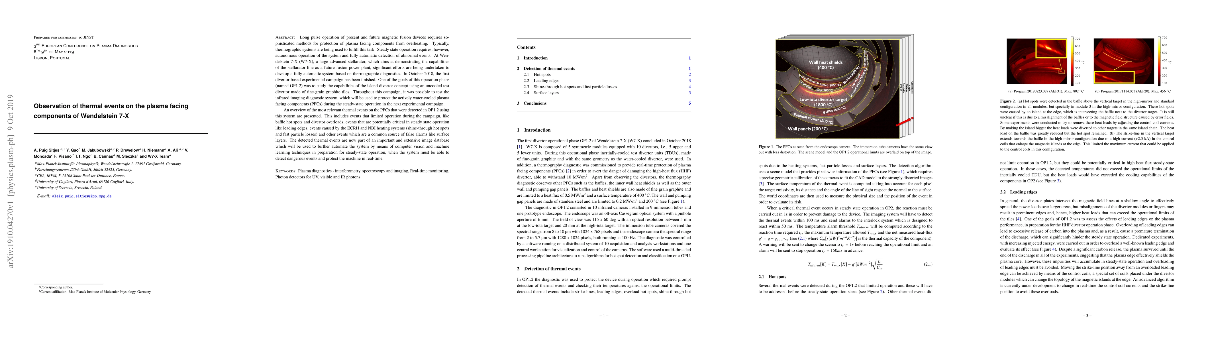 This paper reports on the first divertor-based experimental campaign (OP1.2) at Wendelstein 7-X, focusing on detecting thermal events on plasma facing components using an infrared imaging system. The study aims to develop a fully automatic thermographic diagnostic system for real-time protection of components during future steady-state operations, highlighting various thermal events and their implications for machine safety.